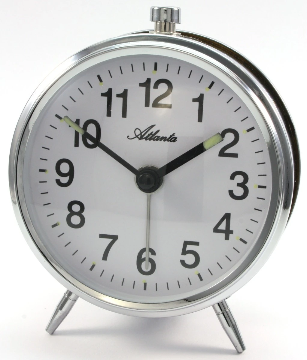 Mechanický budík Atlanta. Budík má černý ciferník s černým číselníkem. Hodinovou a minutovou ručku. Konce ručiček jsou lumunescenční stejně jako indexy. Průměr ciferníku 78mm.