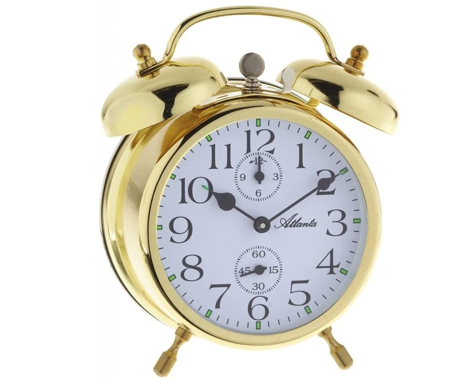 Mechanický budík Atlanta. Budík má bílý ciferník s černým číselníkem. Hodinovou a minutovou ručku. Konce ručiček jsou lumunescenční stejně jako indexy. Průměr ciferníku 78mm.