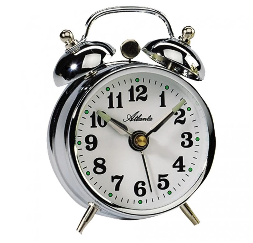 Mechanický budík Atlanta. Budík má bílý ciferník s černým číselníkem. Hodinovou a minutovou ručku. Konce ručiček jsou lumunescenční stejně jako indexy. Průměr ciferníku 64mm.