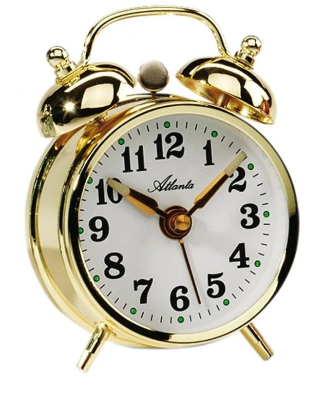Mechanický budík Atlanta. Budík má bílý ciferník s černým číselníkem. Hodinovou a minutovou ručku. Konce ručiček jsou lumunescenční stejně jako indexy. Průměr ciferníku 64mm.