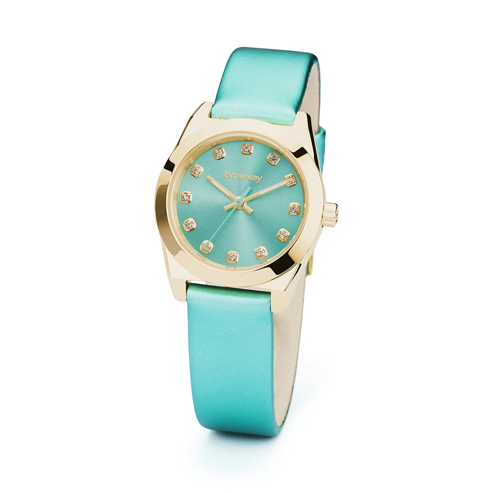Náramkové hodinky pro ženy a dívky Brosway. Průměr ocelového pouzdra hodinek 32 mm. Řemínek se zapínáním na přezku. Hodinky pohání spolehlivý bateriový strojek Miyota 2035. Hodinky mají minerální sklíčko, indexy jsou tvořeny bílými krystalky.