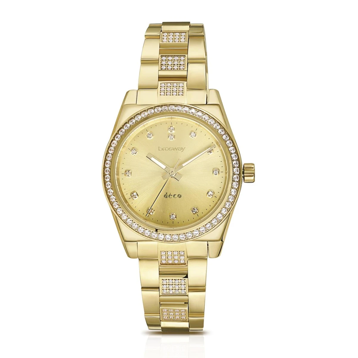 Náramkové hodinky pro ženy a dívky Brosway. Průměr ocelového pouzdra hodinek 32 mm. Ocelový náramek se zapínáním na přezku. Hodinky pohání spolehlivý bateriový strojek Miyota 2035. Hodinky mají minerální sklíčko, hodinovou, minutovou a vteřinovou ručičku. Indexy jsou nahrazeny zirkony.
