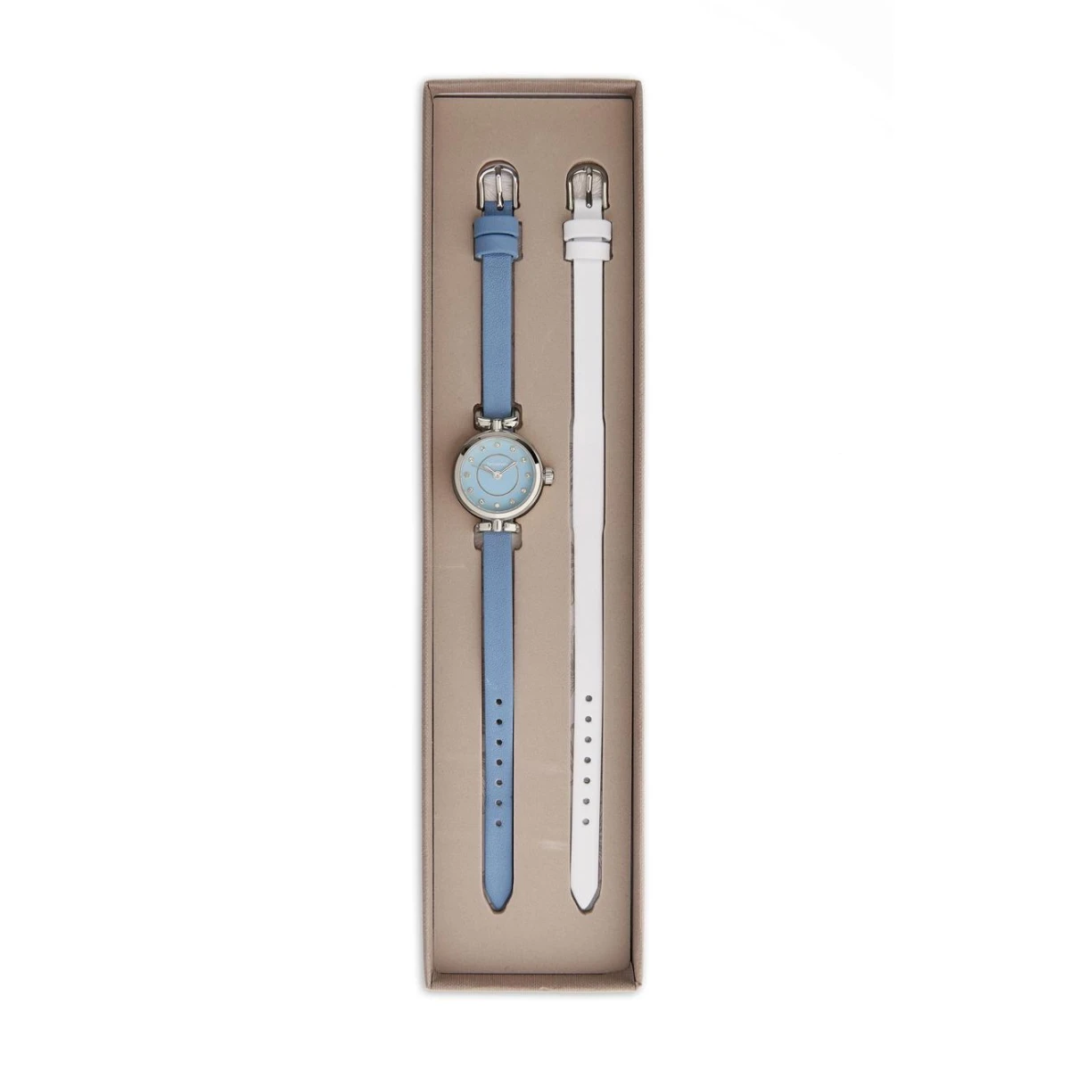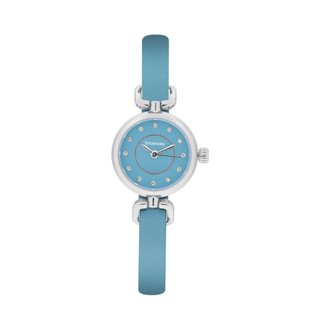 Náramkové hodinky pro ženy a dívky Brosway. Průměr ocelového pouzdra hodinek 26 mm, výška pouzdra 7 mm. Kožený řemínek se zapínáním na ocelovou přezku. Hodinky pohání spolehlivý bateriový strojek Miyota 2035. Minerální sklíčko. Hodinky mají světle modrý ciferník s indexy představovanými kamínky Swarovski. Hodinky jsou vybavené hodinovou, minutovou a vteřinovou ručkou. K hodinkám dostanete bílý kožený řemínek zdarma.