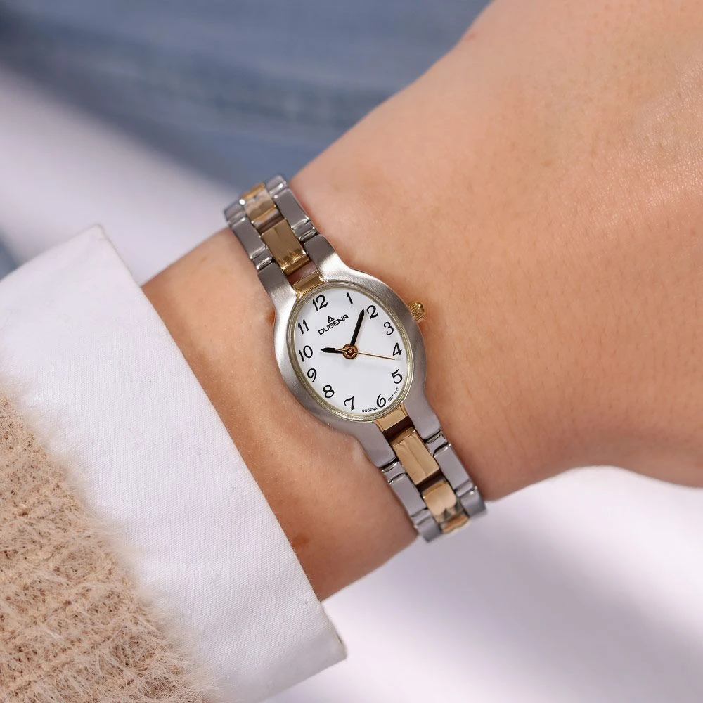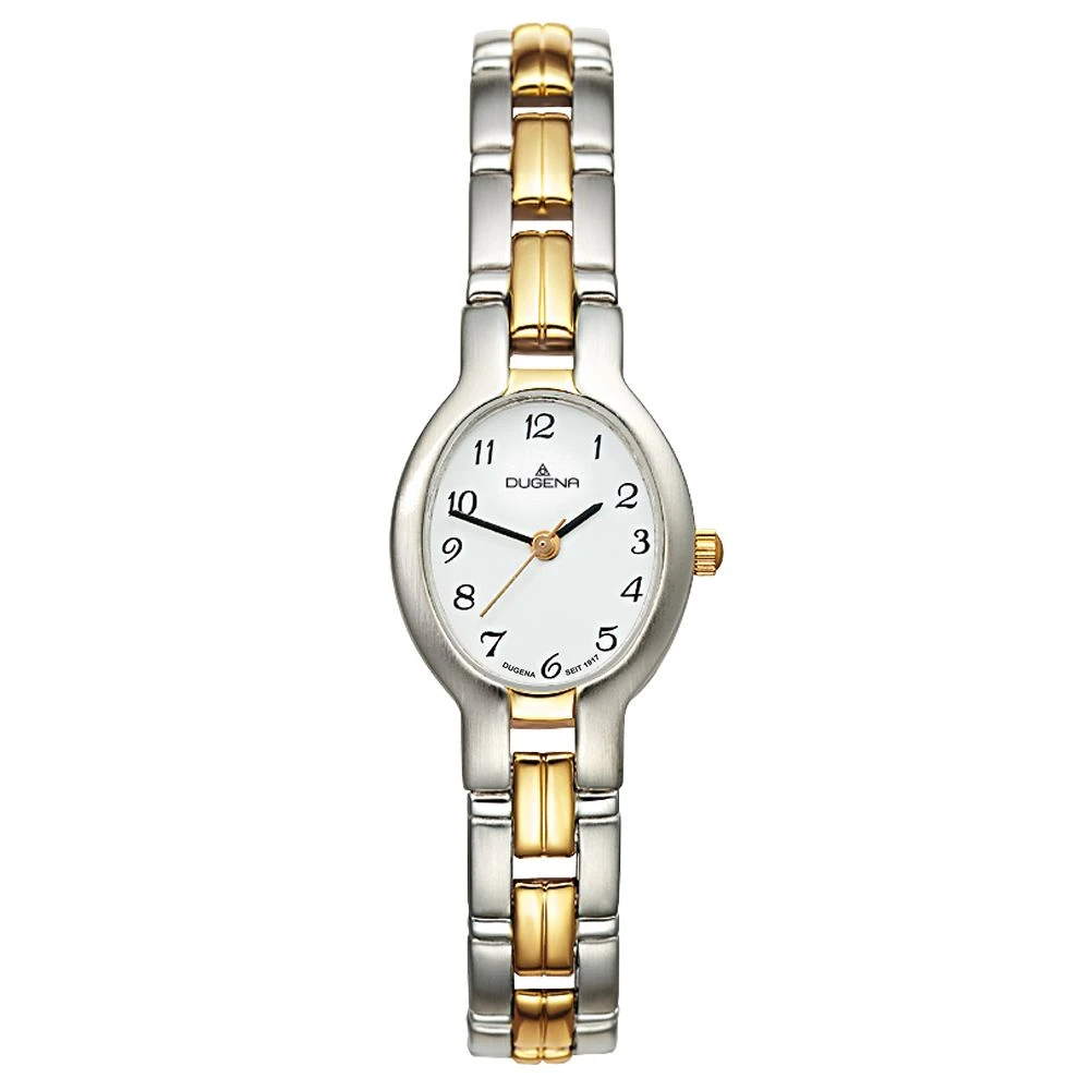 Klasické dámské hodinky z chirurgické oceli. Pouzdro hodinek má leštěné boky a matnou pohledovou část. Rozměr pouzdra 19x31 mm, výška pouzdra 6,5mm. Ocelový náramek se zapínáním na složenou sponu je kombinace mat/lesk, středové články jsou pozlacené technologií PVD. Náramek je široký 10mm. Dámské elegantní hodinky vybavené hodinovou, minutovou a vteřinovou ručičkou. Přehledný bílý ciferník s černým číselníkem chrání minerální sklíčko. Provoz hodinek zajišťuje spolehlivý bateriový strojek. Hodinky jsou voděodolné na úrovni 3ATM. Všechny náramkové hodinky Dugena jsou dodávané pouze v originál krabičce s logem.