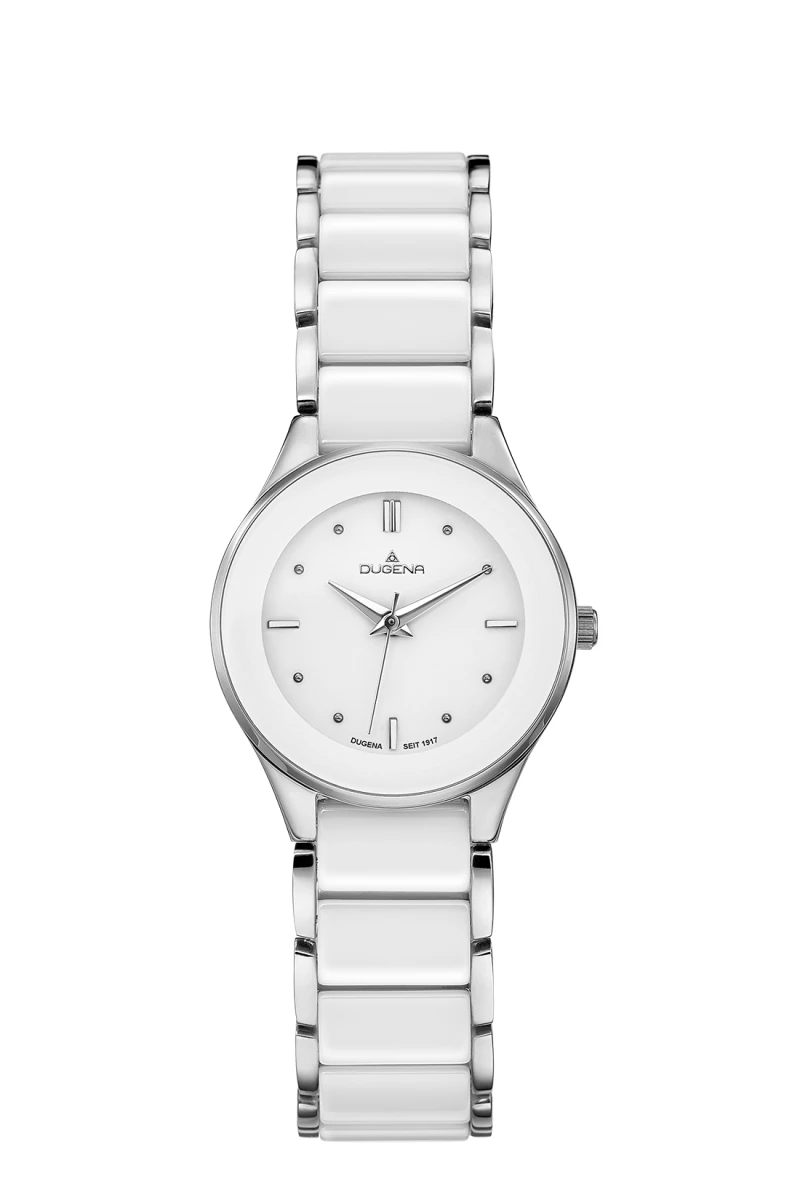 Dámské náramkové hodinky od Německého výrobce Dugena. Hodinky jsou kombinace ušlechtilé chirurgické oceli a keramiky. Hodinky disponují hodinovou, minutovou a vteřinovou ručičkou. Keramická luneta je bílá, bílý ciferník ciferník s indexy. Ocelové pouzdro hodinek se safírovým sklíčkem má průměr 29mm. Provoz hodinek zabezpečuje spolehlivý bateriový strojek. Hodinky jsou dodávané v originální krabičce s logem Dugena. Voděodolnost hodinek 3 ATM.