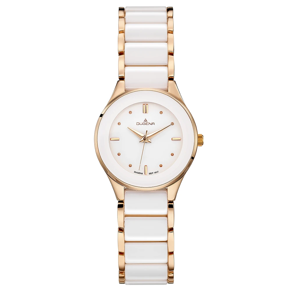 Dámské hodinky Dugena. Hodinky jsou kombinace ušlechtilé oceli a keramiky. Hodinky jsou vybavené hodinovou, minutovou a vteřinovou ručkou. Luneta je z bílé keramiky, bílý ciferník s indexy. Pouzdro hodinek se safírovým sklíčkem má průměr 29mm. Provoz hodinek zajišťuje spolehlivý bateriový strojek. Zlaté části hodinek jsou pozlacené růžovým zlatem technologií PVD. Hodinky jsou dodávané v originální krabičce s logem Dugena. Tyto dámské hodinky jsou voděodolné na úrovni 3 ATM.