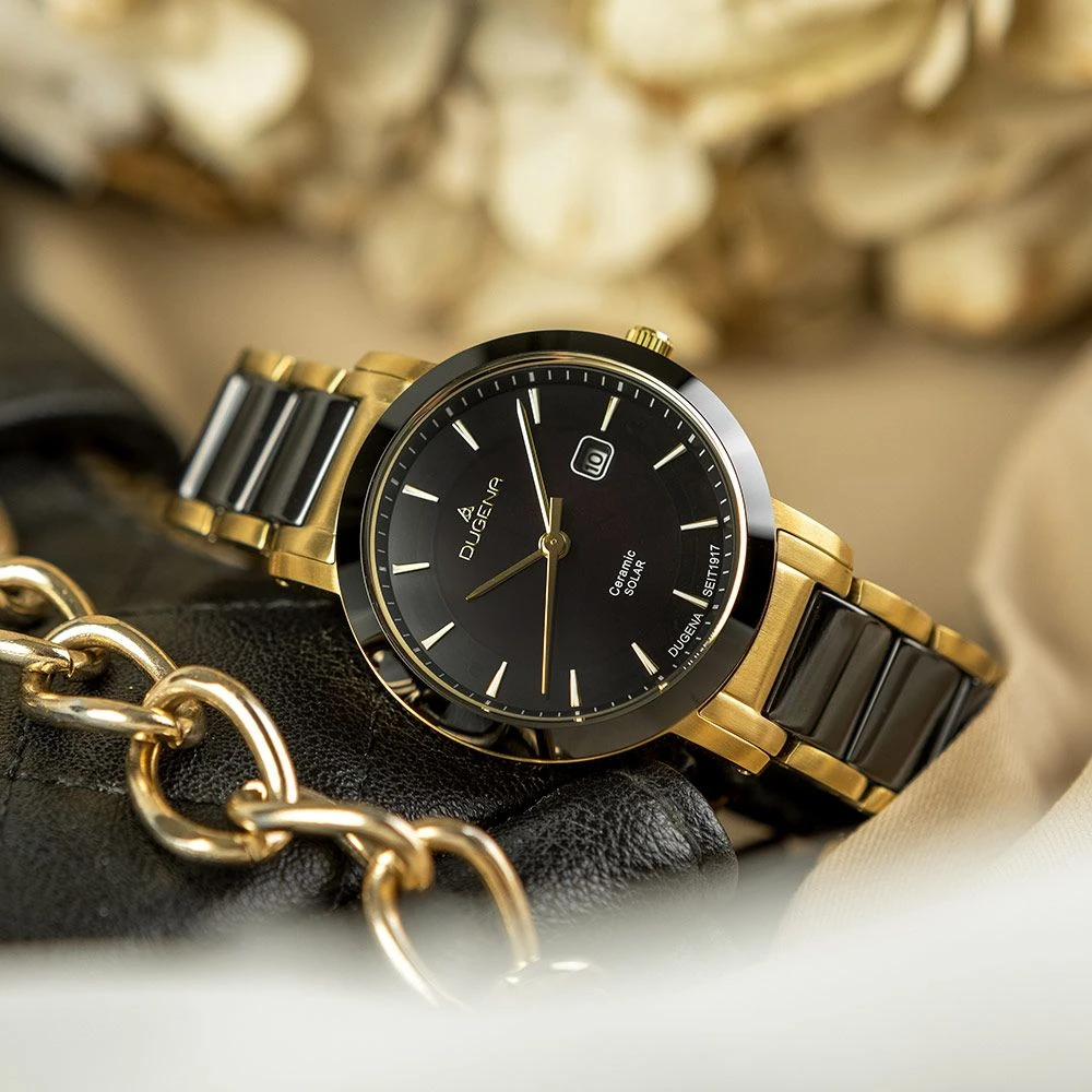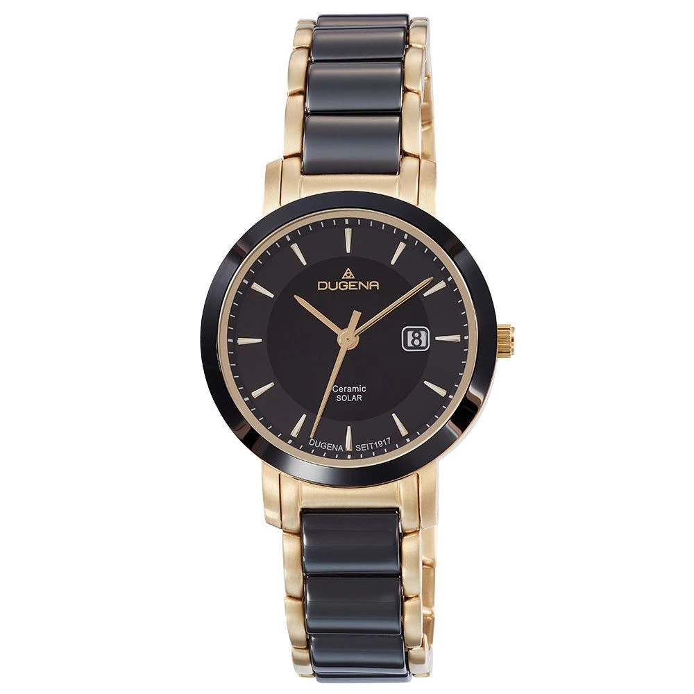 Dámské náramkové hodinky od Německého výrobce Dugena. Hodinky jsou kombinace ušlechtilé chirurgické oceli a keramiky. Hodinky disponují ukazatelem data, hodinovou, minutovou a vteřinovou ručičkou, černý ciferník s indexy. Pouzdro z chirurgické oceli má průměr 30 mm. Pouzdro a ocelové části náramku jsou pozlacené technologií PVD. Provoz hodinek zabezpečuje spolehlivý strojek na solární energii. Hodinky jsou dodávané v originální krabičce s logem Dugena. Voděodolnost hodinek 5 ATM.