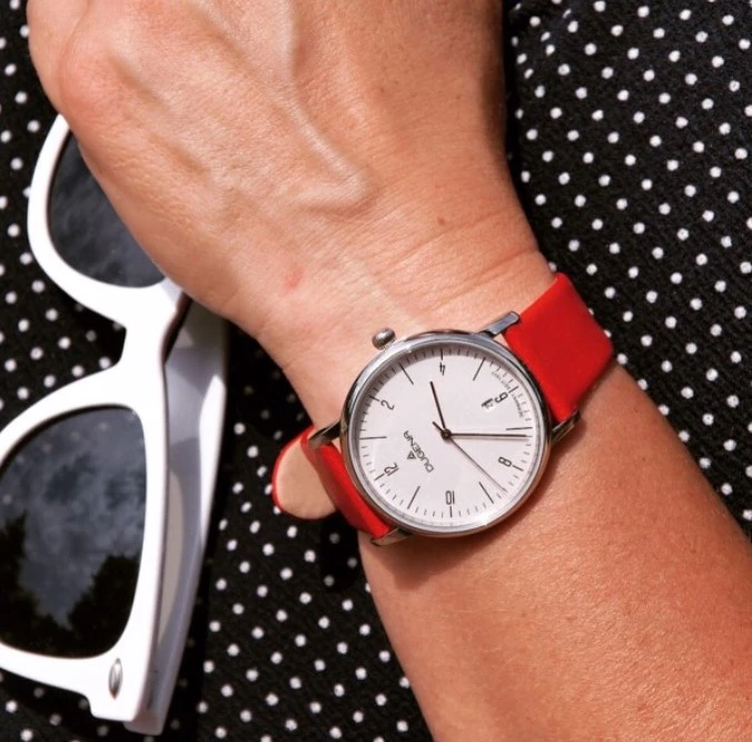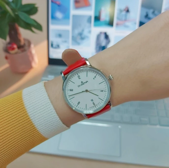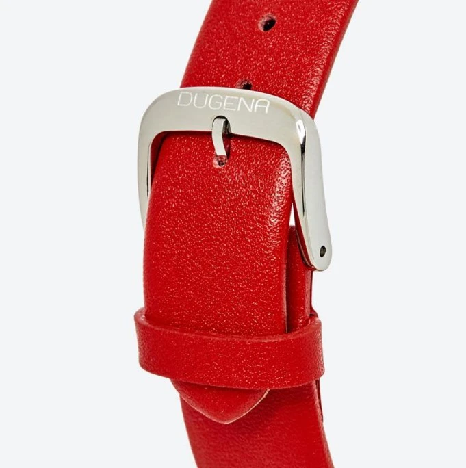 Dámské hodinky Dugena z chirurgické oceli s koženým řemínkem. Sklíčko hodinek je minerální, bílý ciferník s černými arabskými číslicemi a indexy. Hodinky jsou vybavené ukazatelem data, hodinovou, minutovou a vteřinovou ručičkou. Rozměr pouzdra hodinek 38,5x9mm. Provoz hodinek zajišťuje spolehlivý bateriový strojek. Hodinky jsou vodotěsné na úrovni 3 ATM. Na dámské hodinky Dugena je poskytována záruka v délce 36 měsíců. Hodinky jsou balené do dárkové krabičky s logem.