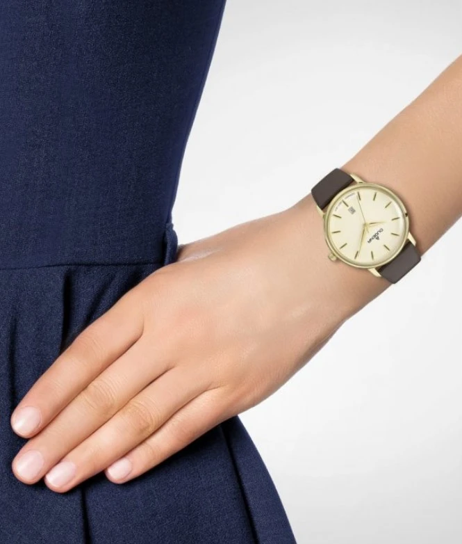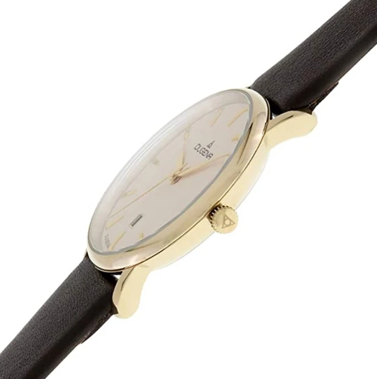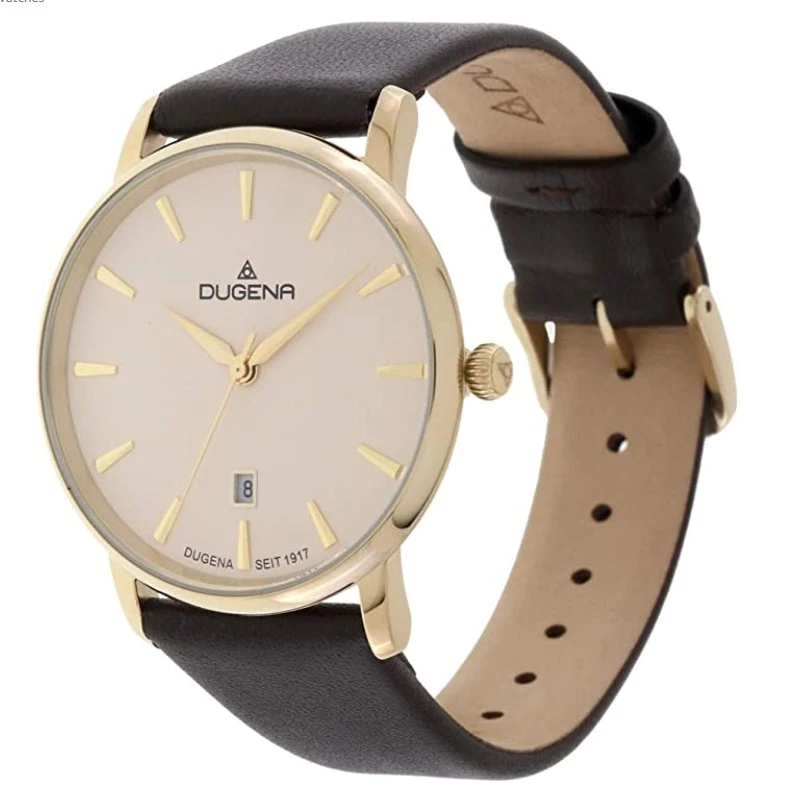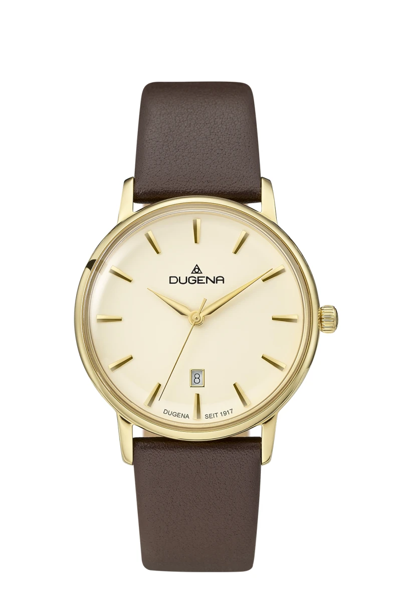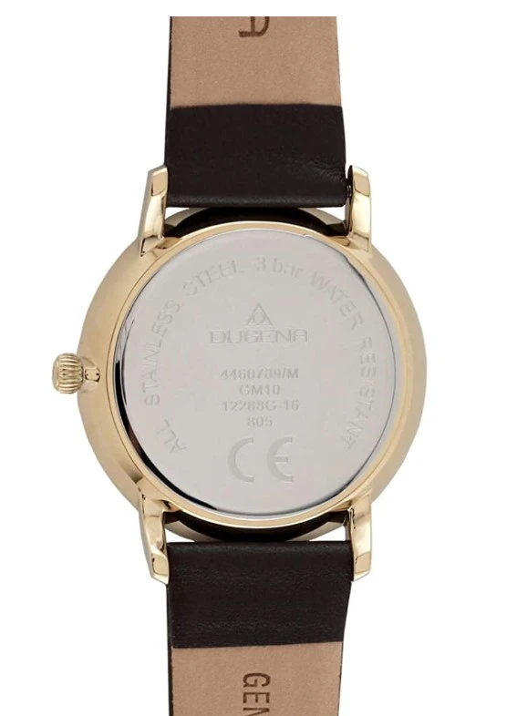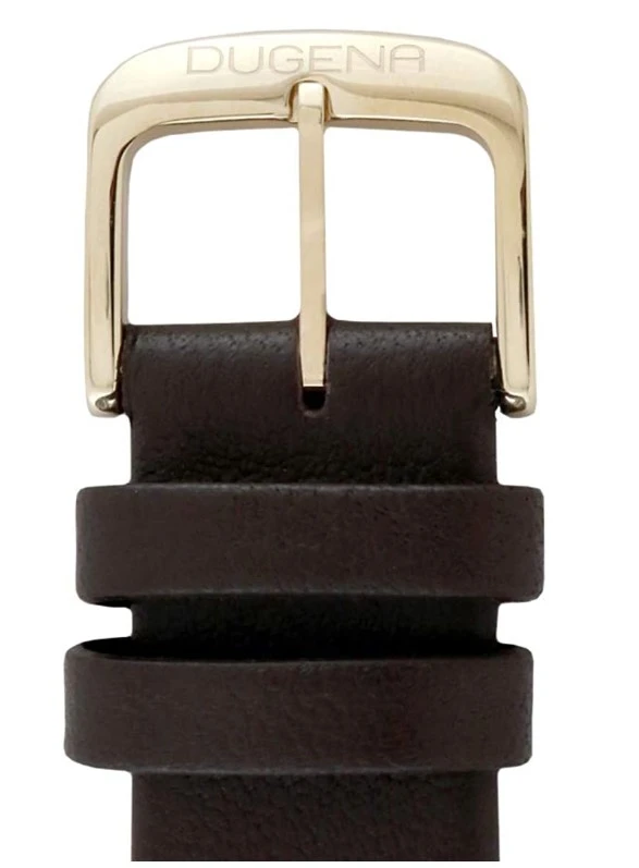 Dámské hodinky Dugena z chirurgické oceli s koženým řemínkem. Sklíčko hodinek je minerální, bílý ciferník s indexy. Hodinky jsou vybavené ukazatelem data, hodinovou, minutovou a vteřinovou ručičkou. Rozměr pouzdra hodinek 38,5x9mm. Hodinky mají pouzdro pozlacené žlutým zlatem technologií IP. Provoz hodinek zajišťuje spolehlivý bateriový strojek. Hodinky jsou vodotěsné na úrovni 3 ATM. Na dámské hodinky Dugena je poskytována záruka v délce 36 měsíců. Hodinky jsou balené do dárkové krabičky s logem.