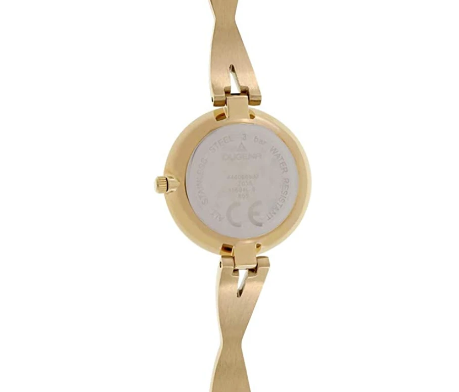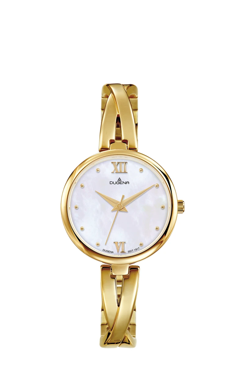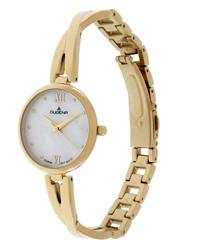 Dámské hodinky Dugena z chirurgické oceli. Sklíčko hodinek je minerální, perleťový ciferník s římskými čísly a indexy. Hodinky jsou vybavené, hodinovou, minutovou a vteřinovou ručičkou. Hodinky jsou pozlacené žlutým zlatem technologií IP. Rozměr pouzdra hodinek 30x8mm. Provoz hodinek zajišťuje spolehlivý bateriový strojek. Hodinky jsou vodotěsné na úrovni 3 ATM. Na dámské hodinky Dugena je poskytována záruka v délce 36 měsíců. Hodinky jsou balené do dárkové krabičky s logem.