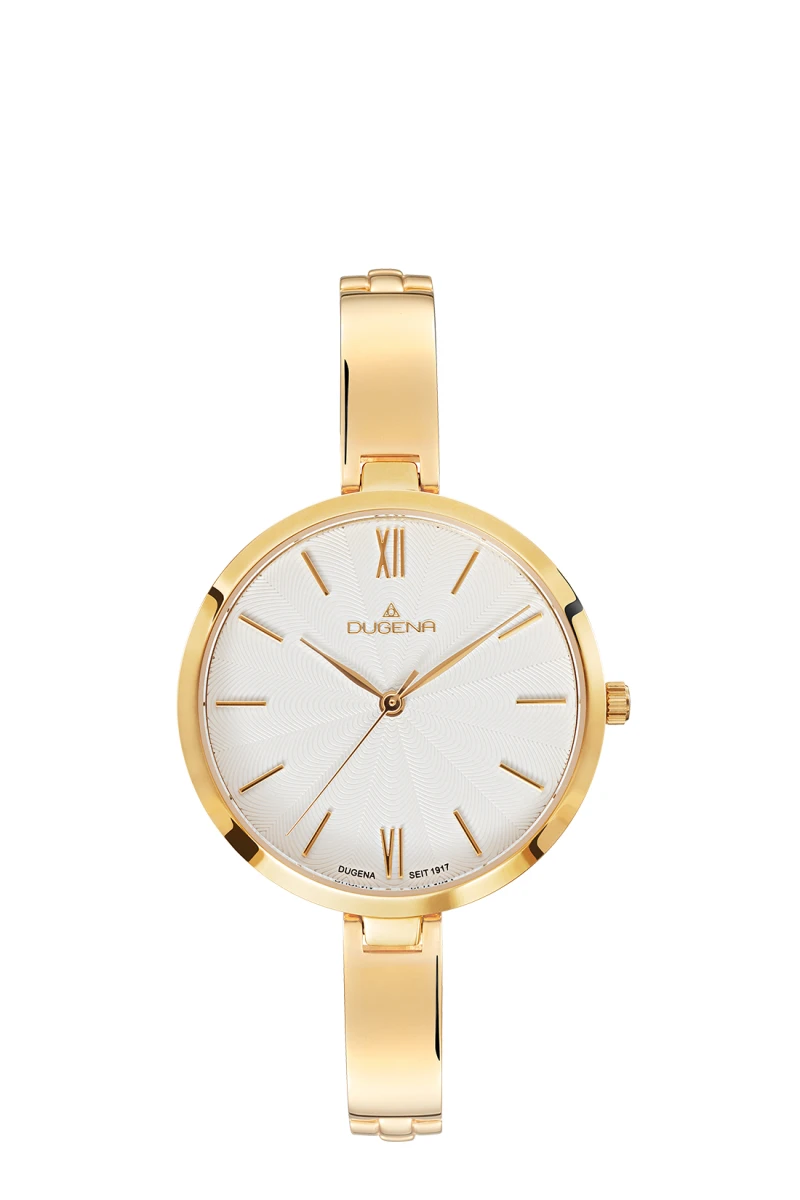 Dámské hodinky Dugena z chirurgické oceli. Sklíčko hodinek je minerální, bílý ciferník s římskými čísly a indexy. Hodinky jsou vybavené, hodinovou, minutovou a vteřinovou ručičkou. Průměr pouzdra hodinek 34 mm. Provoz hodinek zajišťuje spolehlivý bateriový strojek. Hodinky jsou vodotěsné na úrovni 5 ATM. Povrch hodinek je pozlacený žlutým zlatem technologií PVD. Na dámské hodinky Dugena je poskytována záruka v délce 36 měsíců. Hodinky jsou balené do dárkové krabičky s logem.