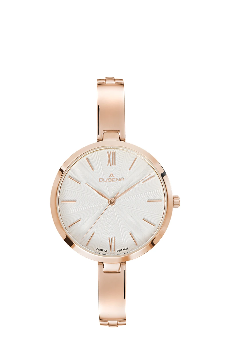 Dámské hodinky Dugena z chirurgické oceli. Sklíčko hodinek je minerální, bílý ciferník s římskými čísly a indexy. Hodinky jsou vybavené, hodinovou, minutovou a vteřinovou ručičkou. Průměr pouzdra hodinek 34 mm. Provoz hodinek zajišťuje spolehlivý bateriový strojek. Hodinky jsou vodotěsné na úrovni 5 ATM. Povrch hodinek je pozlacený růžovým zlatem technologií PVD. Na dámské hodinky Dugena je poskytována záruka v délce 36 měsíců. Hodinky jsou balené do dárkové krabičky s logem.