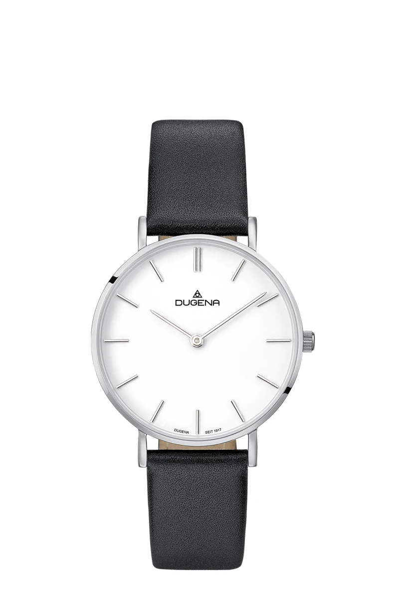 Hodinky dámské Dugena s koženým řemínkem. Hodinky mají pouzdro vyrobené z chirurgické oceli, sklíčko hodinek je minerální. Bílý kulatý ciferník s indexy. Hodinky jsou vybavené hodinovou a minutovou ručkou. Rozměr pouzdra 33,5x7 mm. Chod hodinek zajišťuje spolehlivý bateriový strojek. Hodinky jsou vodotěsné na úrovni 3 ATM. Na všechny dámské hodinky Dugena platí záruka v délce 36 měsíců. Hodinky jsou dodávané v dárkové krabičce s logem.