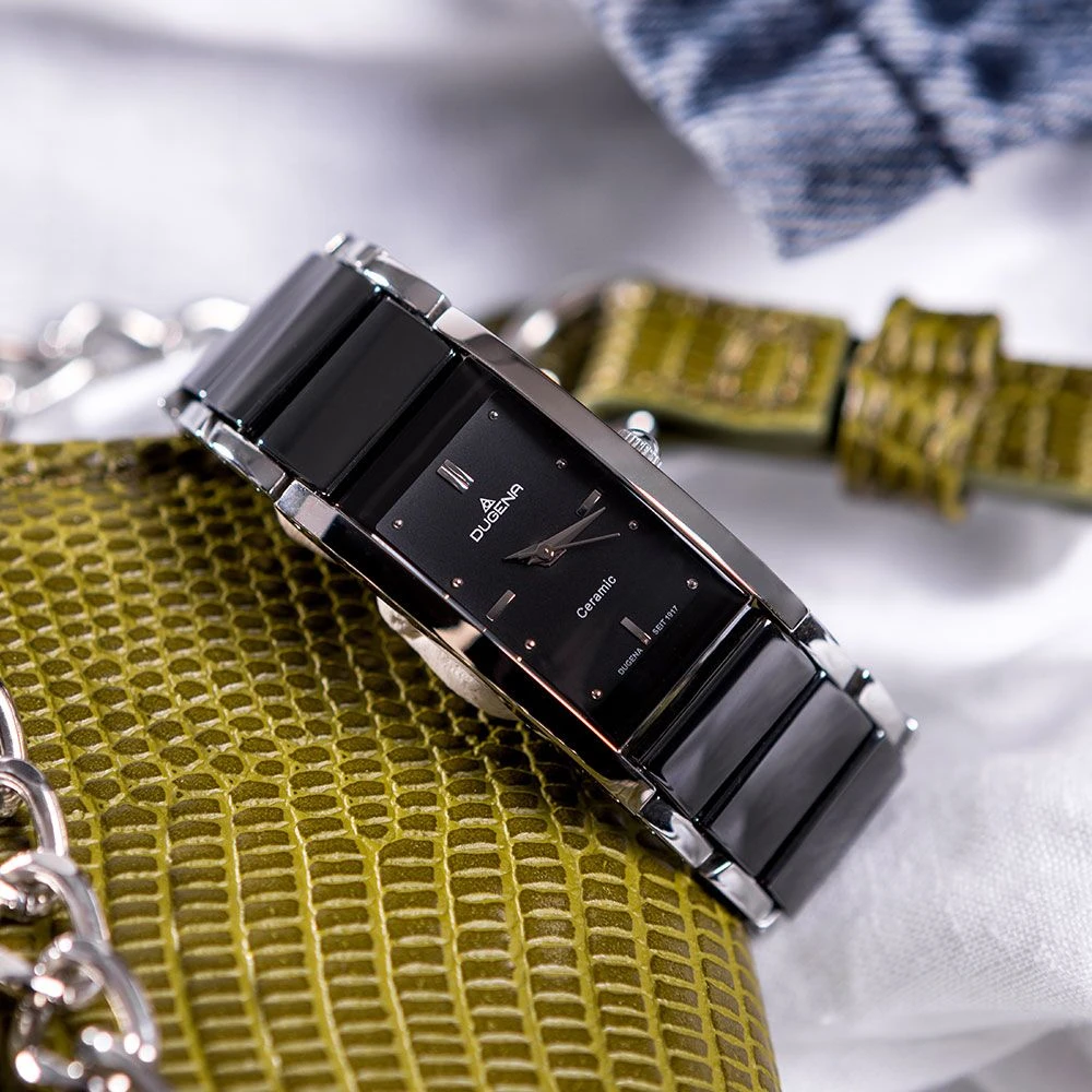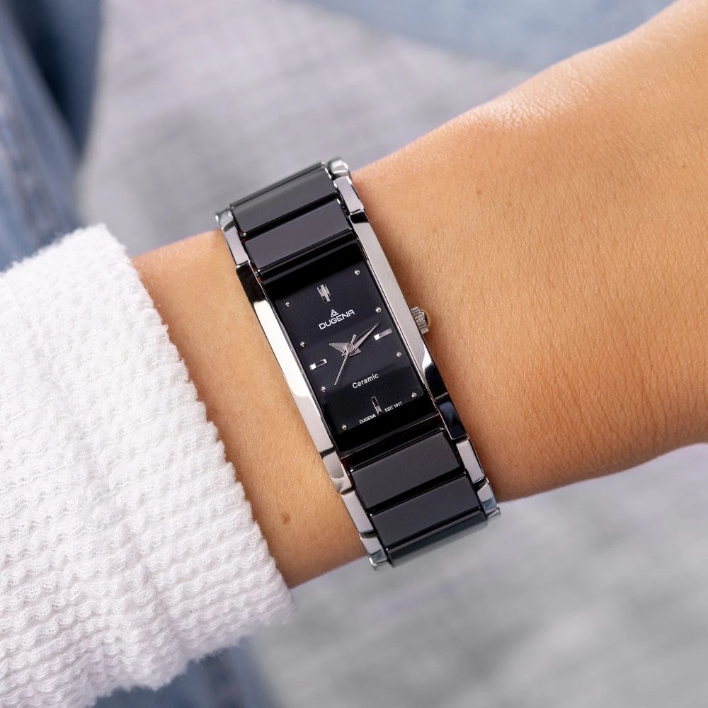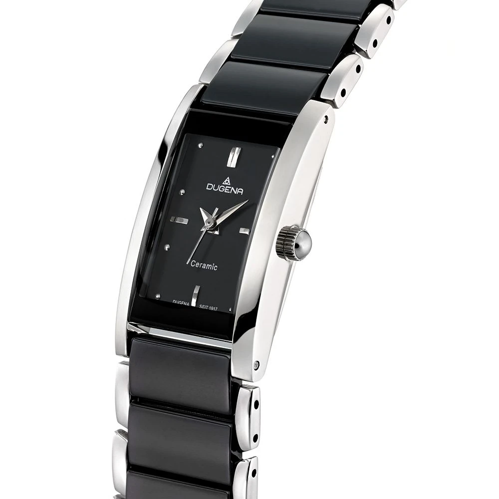 Dámské náramkové hodinky od Německého výrobce Dugena. Hodinky jsou kombinace ušlechtilé chirurgické oceli a keramiky. Hodinky disponují hodinovou, minutovou a vteřinovou ručičkou, černý ciferník s indexy. Pouzdro z chirurgické oceli má rozměr 20x35mm, tloušťka pouzdra 9mm. Provoz hodinek zabezpečuje spolehlivý bateriový strojek. Hodinky jsou dodávané v originální krabičce s logem Dugena. Voděodolnost hodinek 3 ATM.