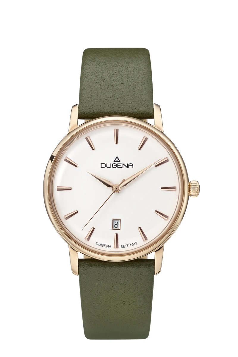 Dámské hodinky Dugena z chirurgické oceli s koženým řemínkem. Sklíčko hodinek je minerální, bílý ciferník s indexy. Hodinky jsou vybavené ukazatelem data, hodinovou, minutovou a vteřinovou ručičkou. Rozměr pouzdra hodinek 38,5x9mm. Hodinky mají pouzdro pozlacené růžovým zlatem technologií IP. Provoz hodinek zajišťuje spolehlivý bateriový strojek. Hodinky jsou vodotěsné na úrovni 3 ATM. Na dámské hodinky Dugena je poskytována záruka v délce 36 měsíců. Hodinky jsou balené do dárkové krabičky s logem.