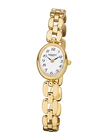 Dámské hodinky na ruku od německého výrobce Regent. Hodinky jsou vyrobené z chirurgické oceli. Hodinky jsou vybavené hodinovou a minutovou ručkou, které zobrazují čas na bílém ciferníku s černým číselníkem. Pouzdro hodinek má rozměr 22x17 mm, výška pouzdra 7 mm. Náramek se zapínáním na jednoduchou sponu je široký 9 mm. Provoz hodinek zajišťuje spolehlivý bateriový strojek. Hodinky jsou dodávané v originální krabičce s logem Regent. Hodinky mají povrch pozlacený technologií PVD. Tyto dámské hodinky jsou voděodolné na úrovni 3 ATM.