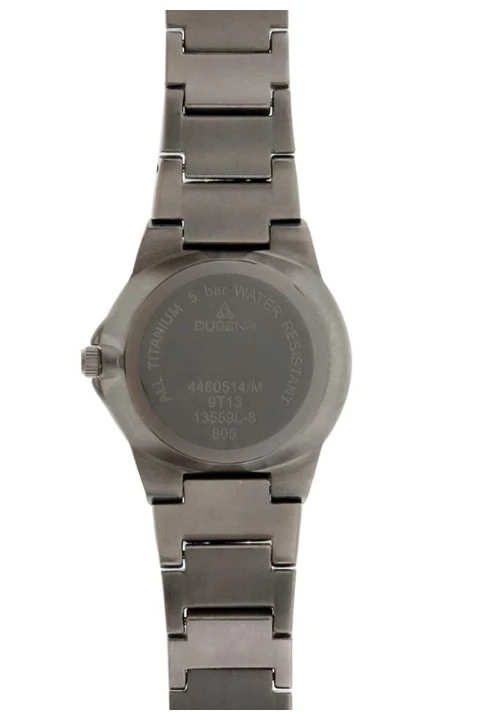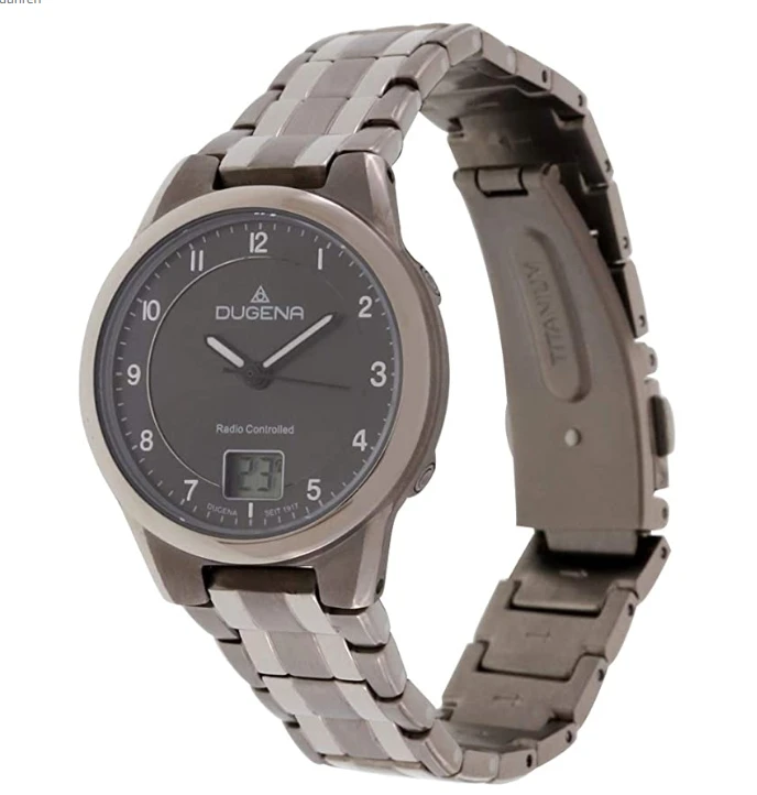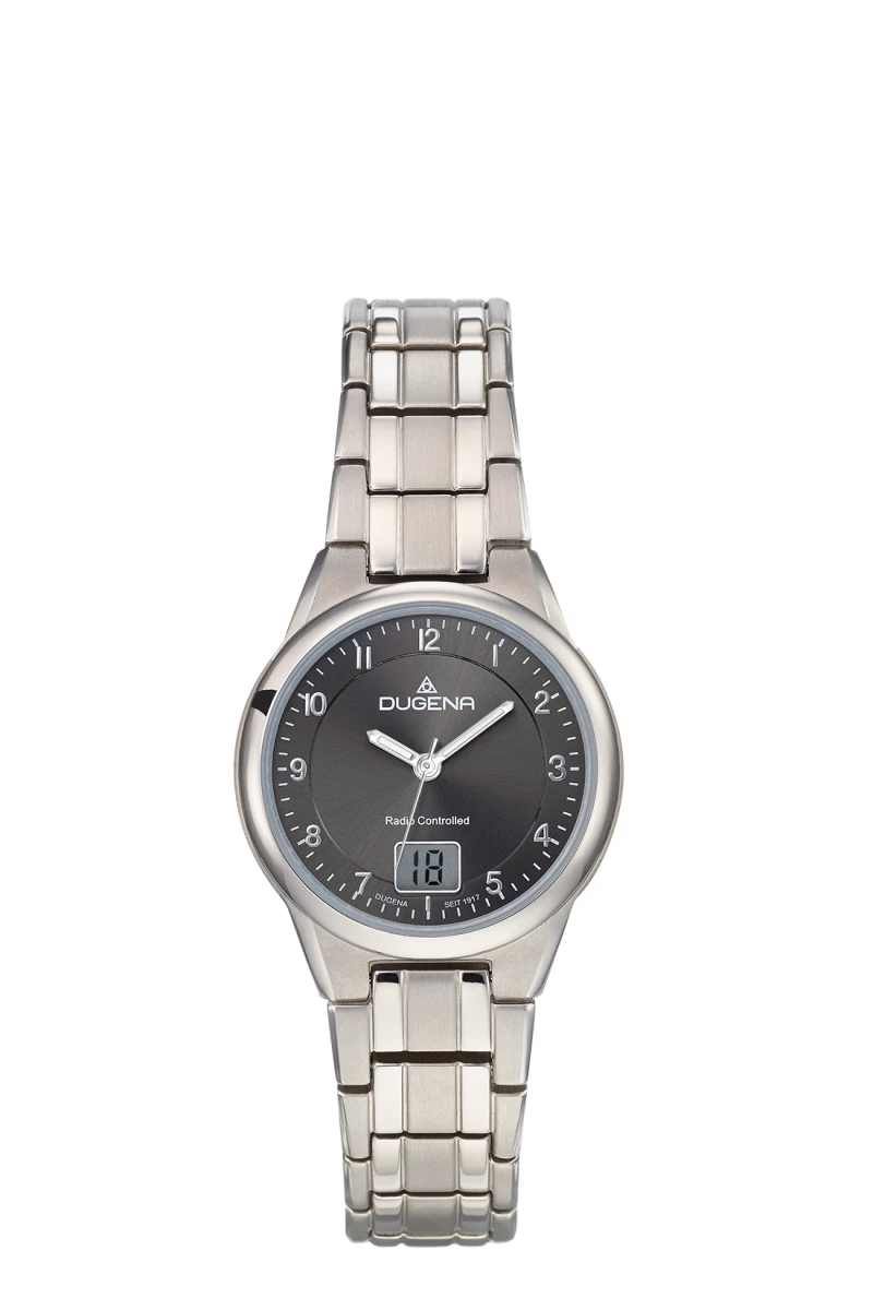 Hodinky Dugena pro ženy vyrobené z titanu. Sklíčko hodinek je minerální. Kulatý černý ciferník s arabskými čísly a ukazatelem data. Hodinky mají hodinovou, minutovou a vteřinovou ručičku. Rozměr pouzdra 28x7 mm. Chod hodinek zajišťuje spolehlivý bateriový strojek. Hodinky jsou řízené radiovým signálem, proto mají velice přesný chod. Hodinky jsou vodotěsné na úrovni 5 ATM. Na všechny dámské hodinky Dugena platí záruka v délce 36 měsíců. Hodinky jsou dodávané v dárkové krabičce s logem.