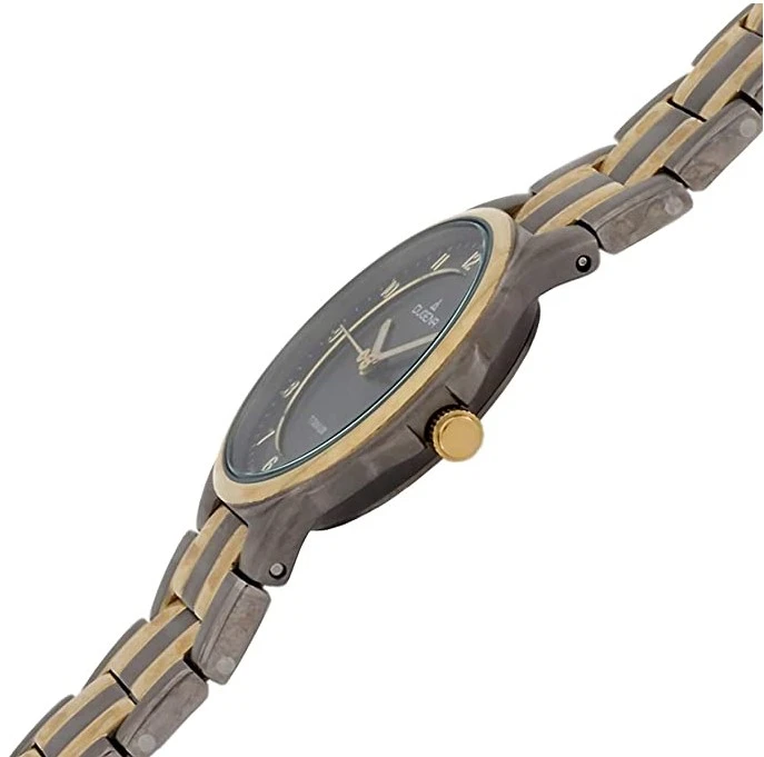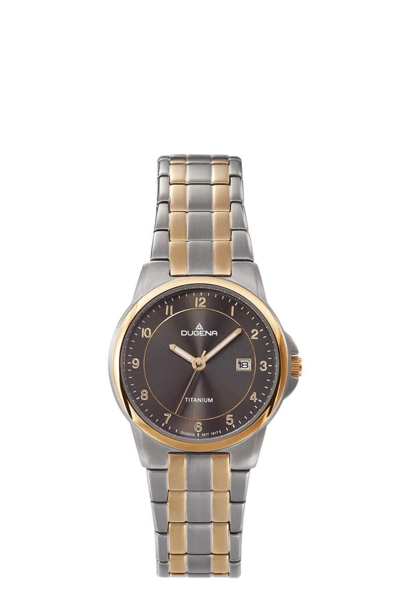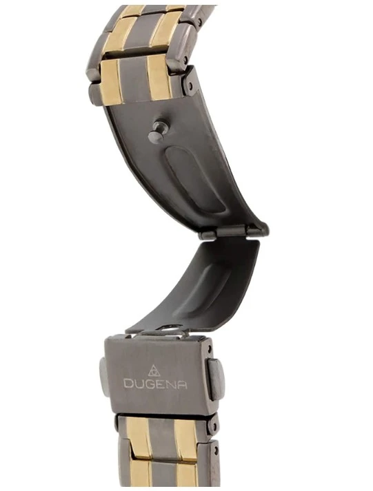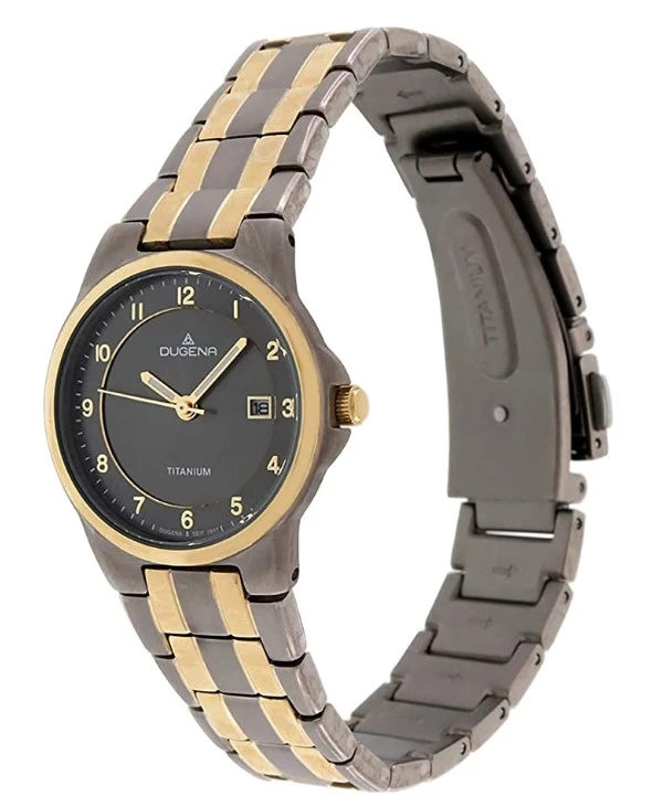 Hodinky Dugena pro ženy vyrobené z titanu. Sklíčko hodinek je minerální. Kulatý černý ciferník s arabskými čísly a ukazatelem data. Hodinky mají hodinovou, minutovou a vteřinovou ručičku. Rozměr pouzdra 28x7 mm. Prvky v barvě žlutého zlata jsou pozlacené technologií IP. Chod hodinek zajišťuje spolehlivý bateriový strojek. Hodinky jsou vodotěsné na úrovni 5 ATM. Na všechny dámské hodinky Dugena platí záruka v délce 36 měsíců. Hodinky jsou dodávané v dárkové krabičce s logem.