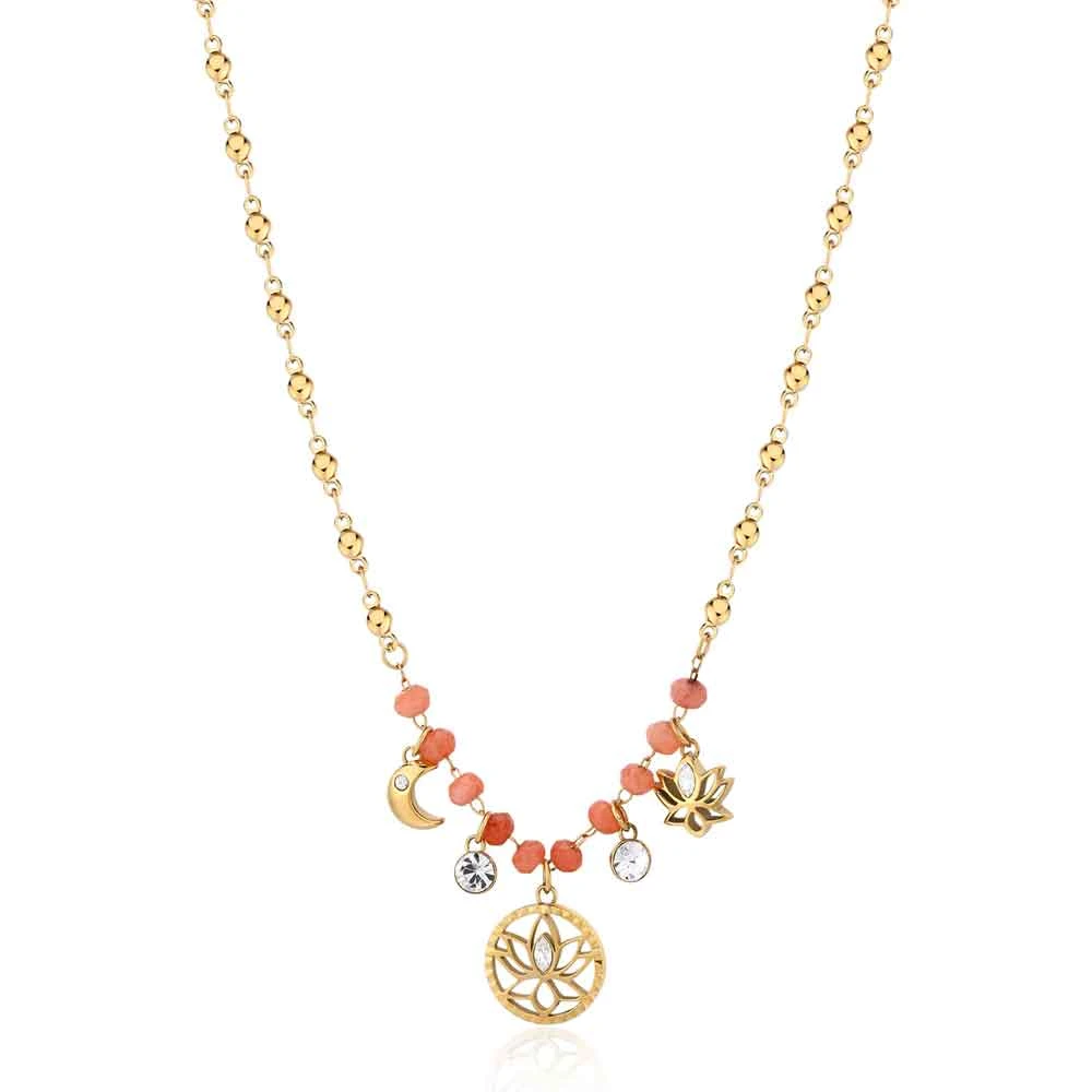 Náhrdelník z chirurgické oceli 316L z kolekce Chakra. Dámský náhrdelník s přívěsky lotosového květu, měsíce a čirými krystaly. Povrch náhrdelníku je pozlacený technologií PVD. Délka náhrdelníku 48cm.