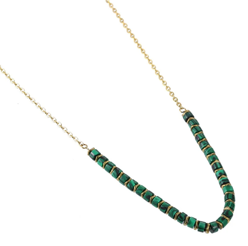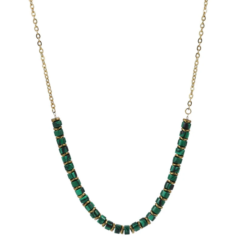 Pozlacený náhrdelník pro ženy z chirurgické oceli a korálků ze syntetického malachitu. Části z chirurgické oceli jsou pozlacené 14K karátovým žlutým zlatem. Korálky mají průměr 4 mm, očka ocelového řetízku jsou široká 2 mm. Délku náhrdelníku lze nastavit v rozmezí 42-45 cm.