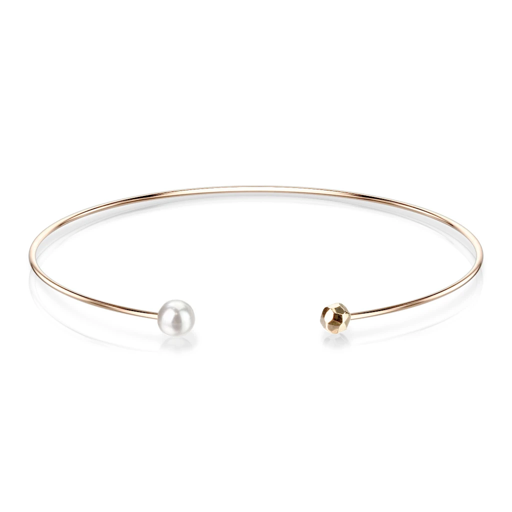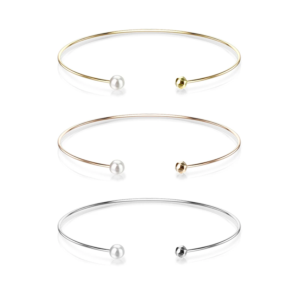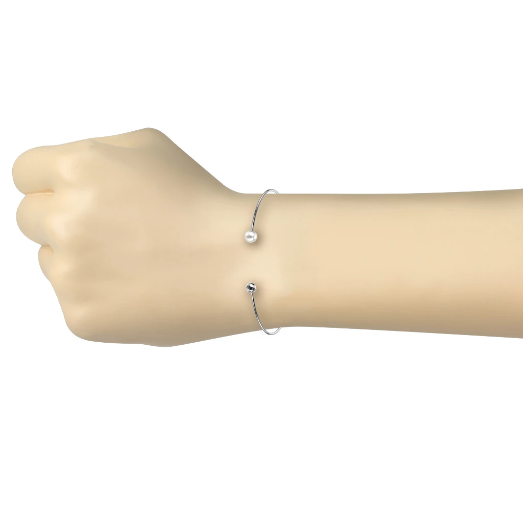 Pevný náramek z chirurgické oceli pro ženy. Náramek velmi jemný náramek široký pouze 1,1 mm. Umělá perlička má průměr 5 mm, průměr broušené kuličky 4 mm. Vnitřní průměr náramku 60 mm.