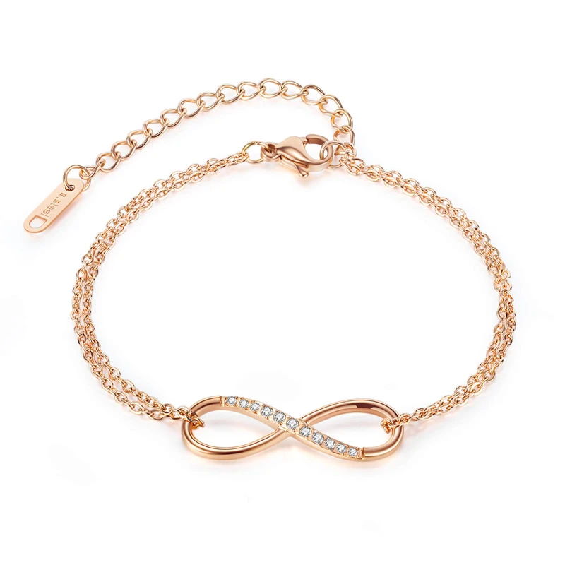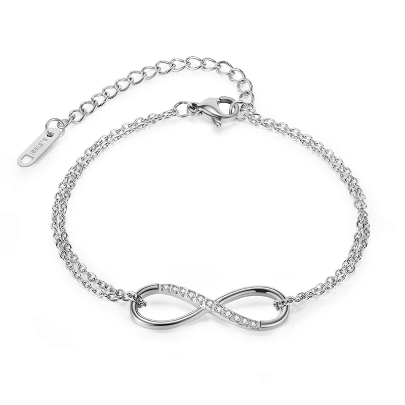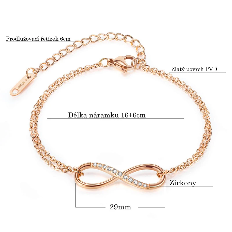 Náramek z chirurgické oceli se symbolem nekonečna pro ženy a dívky. Náramek má leštěný povrch. Symbol nekonečna je ozdobený zářivými zirkony. Rozměr ozdoby 29x9mm. Délku náramku lze nastavit v rozmezí 26-22,5cm.