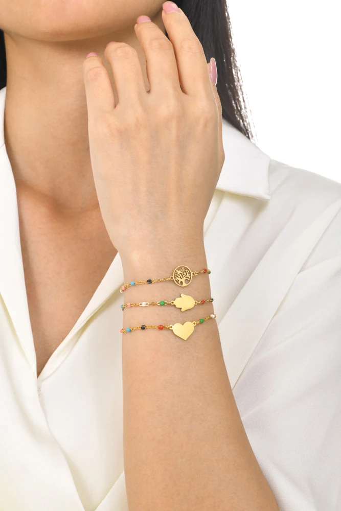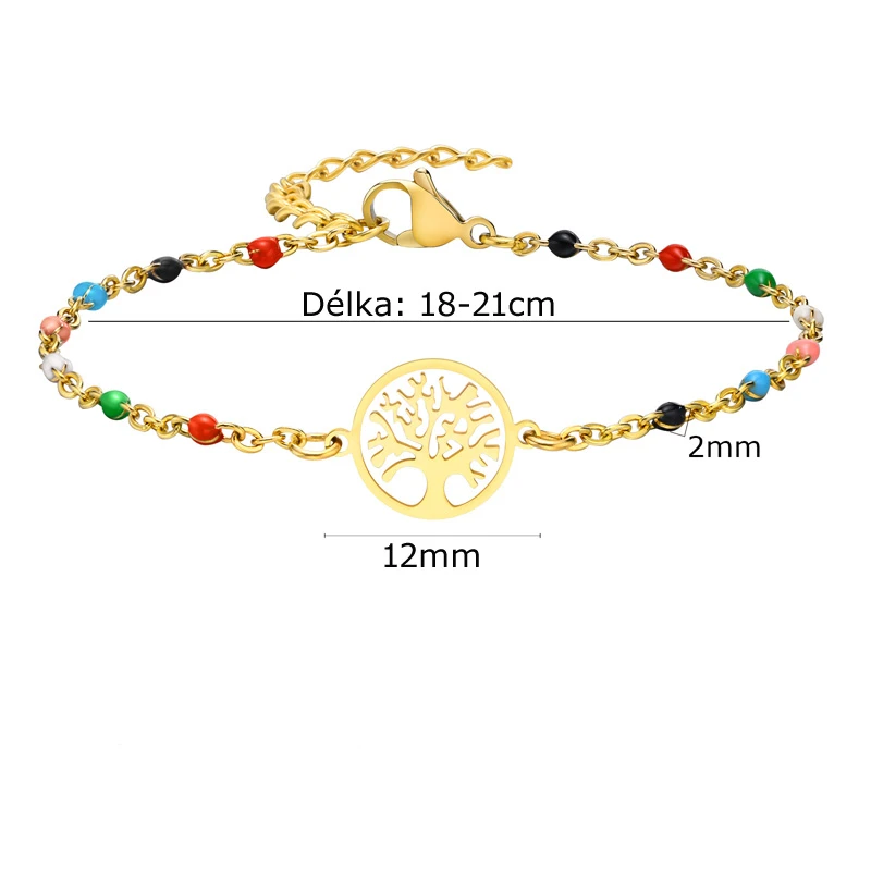 Náramek na ruku z chirurgické oceli s ozdobou stromu života. Dámský náramek s povrchem upraveným technologií PVD na zlatou. Barevné korálky jsou smaltované. Délku náramku lze nastavit v rozmezí 18-21cm.