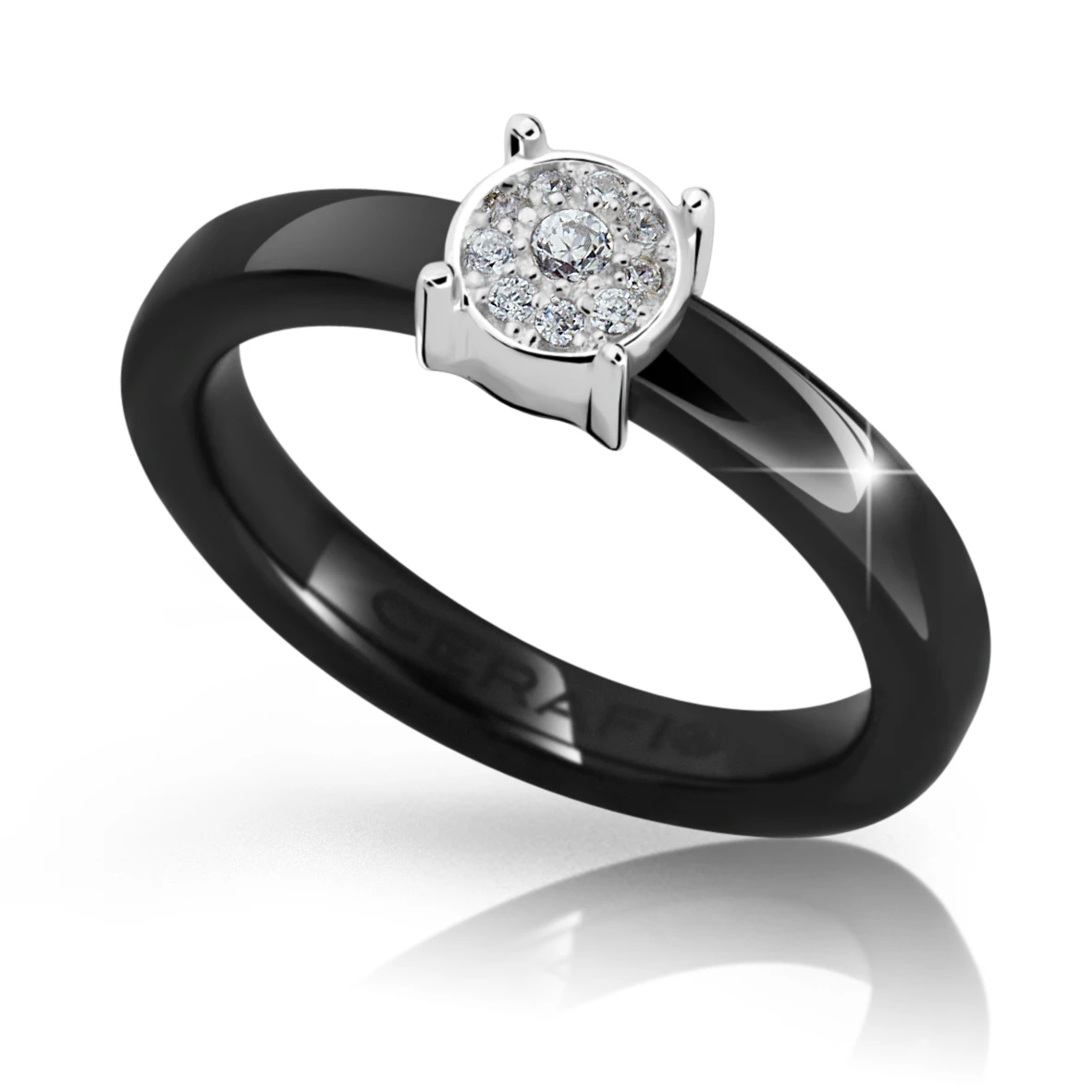 Prsten pro ženy a dívky vyrobený z keramiky se zirkony zasazenými do stříbrné ozdoby. Stříbrná ozdoba má porhodiovaný povrch, nanesené rhodium dodává stříbrné ozdobě jasnou barvu a lesk. Prstýnek je široký 3mm.