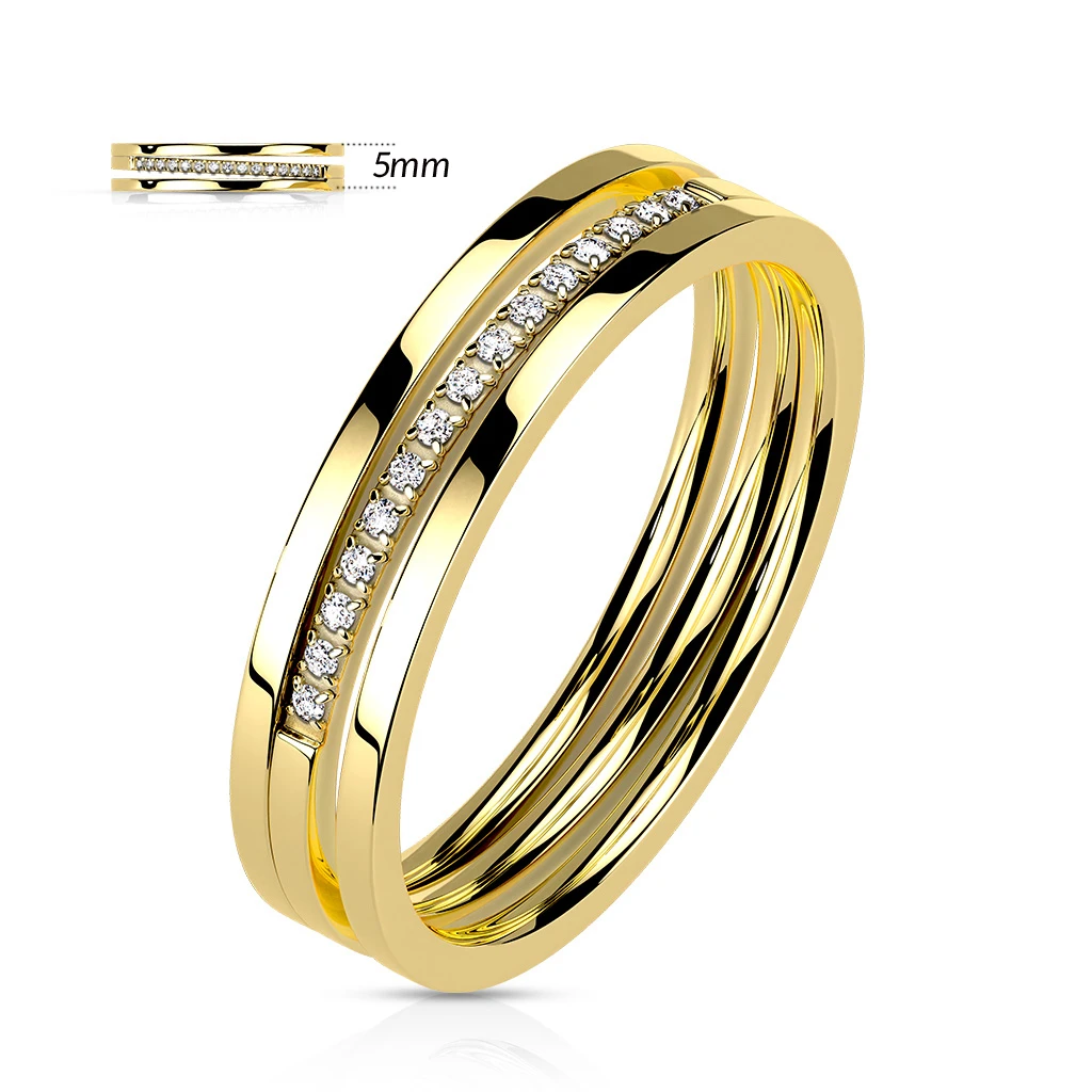 Prstýnek pro ženy a dívky z chirurgické oceli ozdobený zářivými kamínky. Leštěný povrch prstýnku je pozlacený technologií IP. Obroučka prstýnku je široká 5mm.