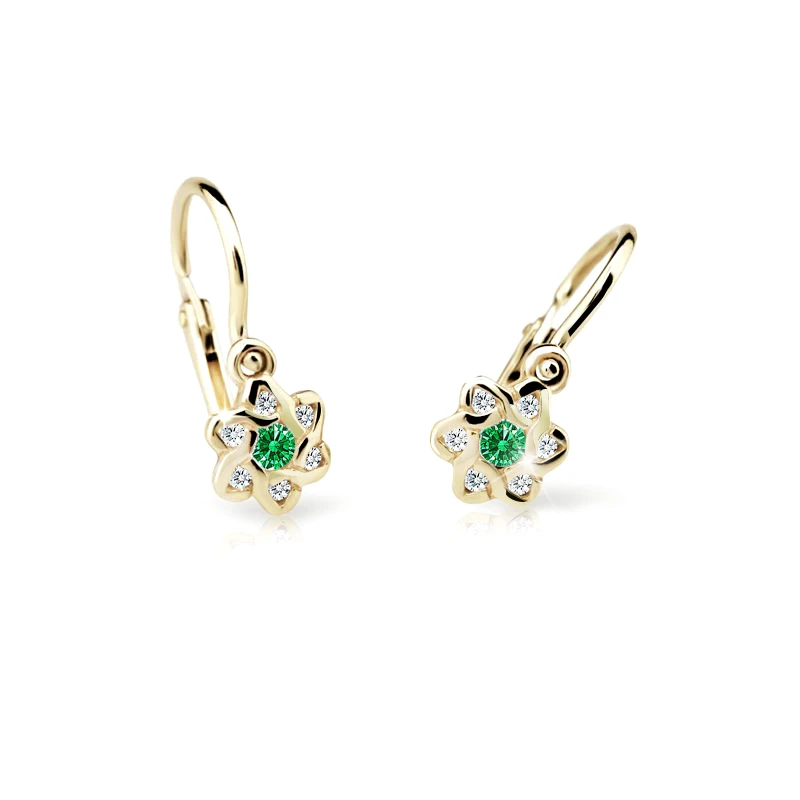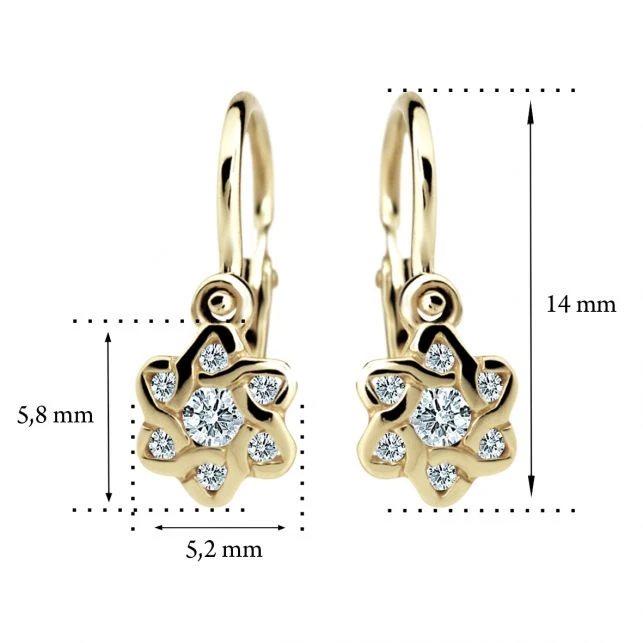 Dětské náušnice ze žlutého zlata ryzosti 585/000. Povrch náušnic je leštěný. Náušnice s ozdobou květu. Květ je zdobený kamínky. Velikost náušnic: 14mm, rozměr ozdoby 5,8x5,2 mm. Náušnice mají bezpečnostní dětské zapínání na brizuru. Krásné dětské náušnice od českého výrobce Cutie Jewellery. Rozměry náušniček najdete zobrazené na přehledné podpůrné fotografii.