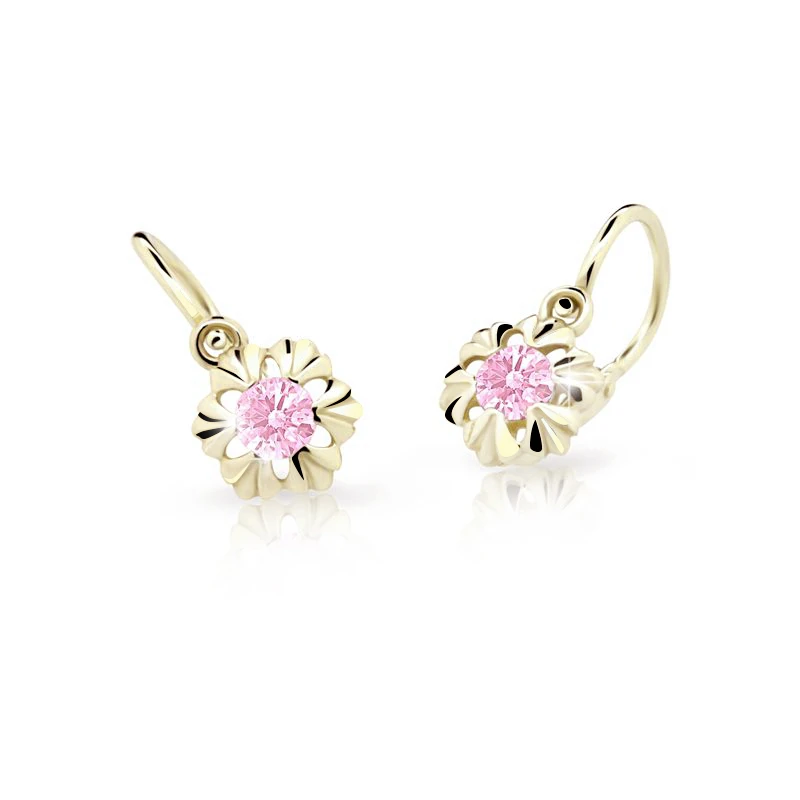 Dětské náušnice kytičky ze žlutého 14ti karátového zlata. Náušnice jsou zkonstruované a vyrobené s ohledem na bezpečné a komfortní užívání pro princezny od nejútlejšího věku. Zapínání náušniček na dětskou brizuru zamezuje jejich snadnému otevření a následné ztrátě dětské náušničky. Kytička se zirkony má rozměr 6,2×7,6 mm, celková „výška“ náušničky 14 mm. Rozměry náušniček najdete přehledně zobrazené na podpůrné fotografii.