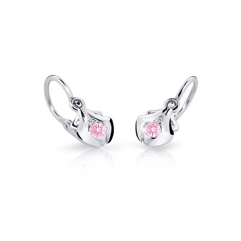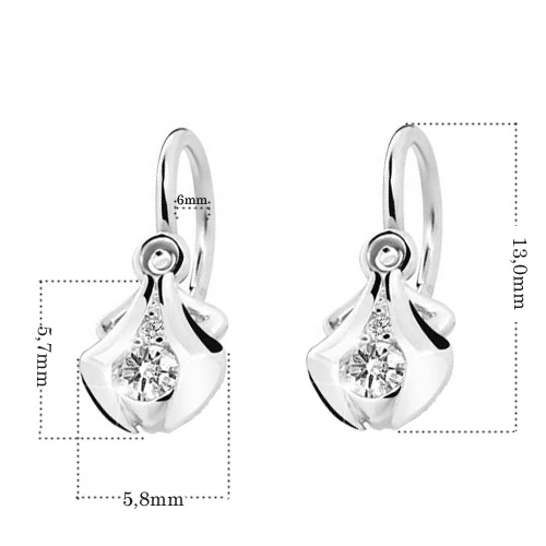 Dětské náušnice vyrobené z bílého zlata 585/1000. Náušnicové zapínání je na dětskou brizuru. Toto zapínání je zkonstruované právě pro dětské náušnice a zamezuje jeho nechtěnému rozevření a následné ztrátě náušničky. Rozměry náušniček 5,8mm x 5,7mm x 13mm najdete přehledně zobrazené na podpůrné fotografii. Náušničky jsou osazené zářivými zirkony.