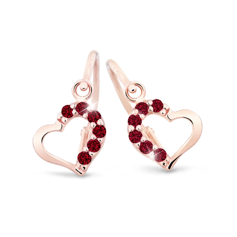 Dětské náušnice srdíčka z růžového 14ti karátového zlata. Náušnice jsou zkonstruované a vyrobené s ohledem na bezpečné a komfortní užívání pro princezny od nejútlejšího věku. Zapínání náušniček na dětskou brizuru zamezuje jejich snadnému otevření a následné ztrátě dětské náušničky. Srdíčko se zirkony má rozměr 7×7 mm, celková „výška“ náušničky 14 mm. Rozměry náušniček najdete přehledně zobrazené na podpůrné fotografii.