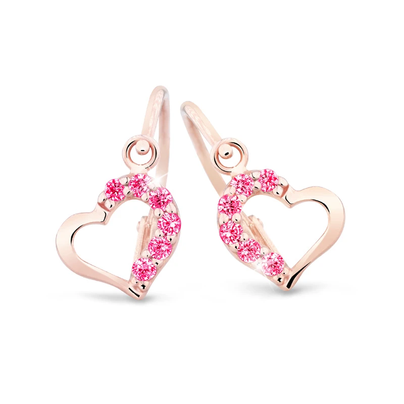 Dětské náušnice srdíčka z růžového 14ti karátového zlata. Náušnice jsou zkonstruované a vyrobené s ohledem na bezpečné a komfortní užívání pro princezny od nejútlejšího věku. Zapínání náušniček na dětskou brizuru zamezuje jejich snadnému otevření a následné ztrátě dětské náušničky. Srdíčko se zirkony má rozměr 7×7 mm, celková „výška“ náušničky 14 mm. Rozměry náušniček najdete přehledně zobrazené na podpůrné fotografii.