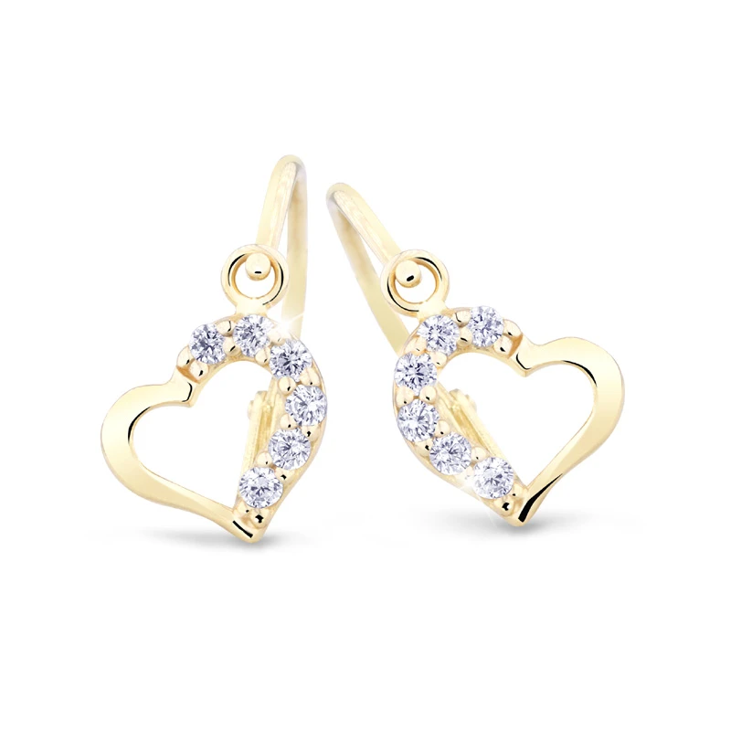 Dětské náušnice srdíčka ze žlutého 14ti karátového zlata. Náušnice jsou zkonstruované a vyrobené s ohledem na bezpečné a komfortní užívání pro princezny od nejútlejšího věku. Zapínání náušniček na dětskou brizuru zamezuje jejich snadnému otevření a následné ztrátě dětské náušničky. Srdíčko se zirkony má rozměr 7×7 mm, celková „výška“ náušničky 14 mm. Rozměry náušniček najdete přehledně zobrazené na podpůrné fotografii.