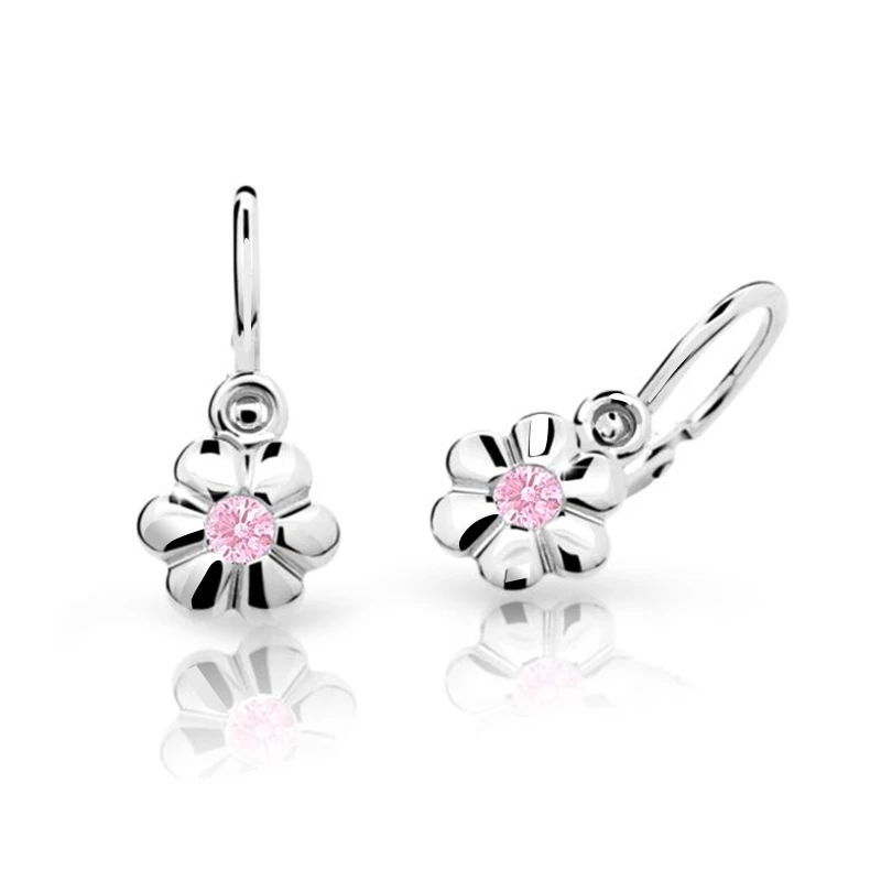 Dětské náušnice z bílého zlata 585/000. Náušnice jsou ozdobené kamínkem. Velikost náušnic 13,8mm, rozměr ozdoby s kamínkem 5,5x5,8mm. Náušnice mají bezpečnostní dětské zapínání na brizuru, které zamezuje snadnému rozevření a ztrátě náušničky.