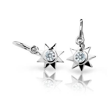 Dětské náušnice z bílého zlata ryzosti 585/000. Náušnice pro děti se zapínáním na bezpečnou dětskou brizuru, která zamezuje snadnému otevření a následné ztrátě dětské náušnice. Ozdoba se zirkony má průměr 6mm, celková výška náušniček 13mm.
