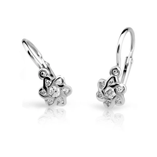 Dětské visací náušnice ze zlata ryzosti 585/000. Povrch náušnic je leštěný. Náušnice s ozdobou květu. Květ je zdobený kamínky. Velikost náušnic: 14mm, rozměr ozdoby 5,8x5,2 mm. Náušnice mají bezpečnostní dětské zapínání na brizuru. Krásné dětské náušnice od českého výrobce CUTIE JEWELLERY. Rozměry náušniček najdete zobrazené na přehledné podpůrné fotografii.