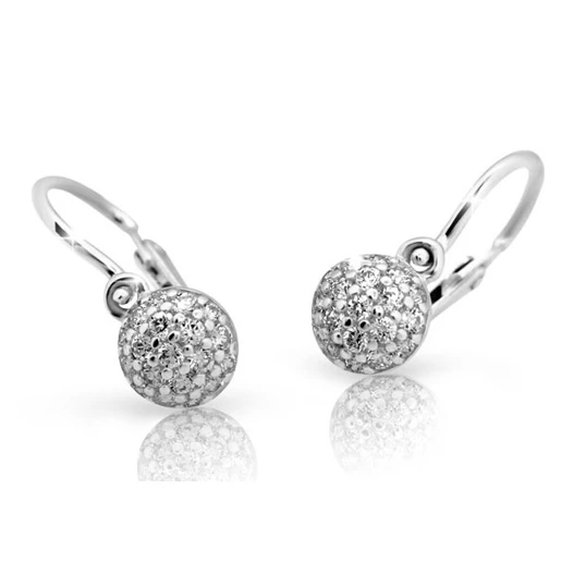 Dětské náušnice z bílého zlata se zirkony. Náušnice jsou navržené a vyrobené s ohledem na bezpečné komfortní nošení pro miminka od nejútlejšího věku. Náušnicové zapínání na dětskou brizuru zamezuje snadnému otevření a následné ztrátě dětské náušničky. Ozdoba se zirkony má průměr 5,5×5,5 mm, celková „výška“ náušničky 13,6 mm. Přehledně zobrazené rozměry náušniček najdete na podpůrné fotografii.
