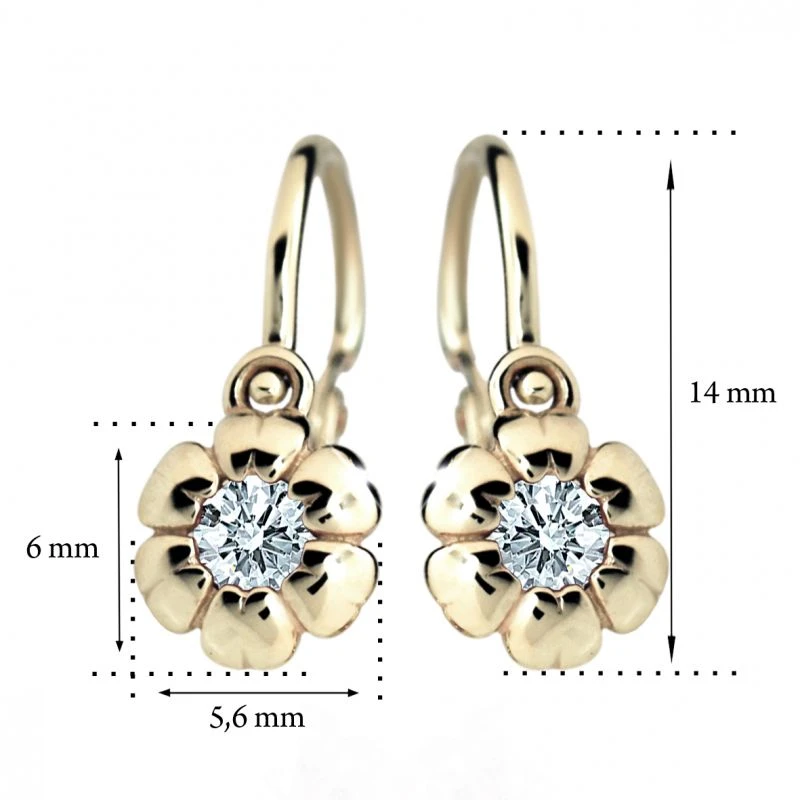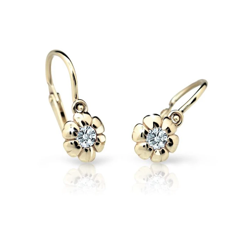 Dětské náušnice ze žlutého zlata ryzosti 585/000. Povrch náušnic je leštěný. Náušnice s ozdobou květu. Ve středu květu je zirkon. Rozměry náušničky najdete zobrazené na podpůrném obrázku. Náušnice mají bezpečnostní dětské zapínání na brizuru. Krásné dětské náušnice od českého výrobce CUTIE JEWELLERY. Uvedená cena za 1 pár.