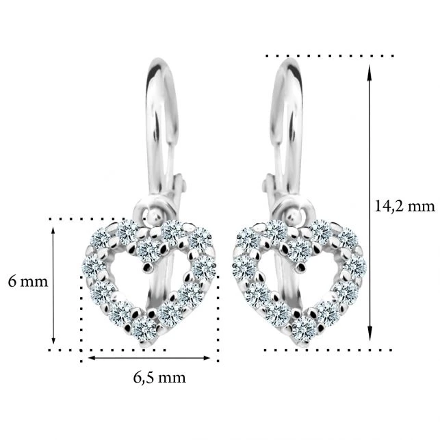 Dětské náušnice srdíčka ze 14ti karátového zlata. Náušnice jsou zkonstruované a vyrobené s ohledem na bezpečné a komfortní užívání pro princezny od nejútlejšího věku. Zapínání náušniček na dětskou brizuru zamezuje jejich snadnému otevření a následné ztrátě dětské náušničky. Srdíčko se zirkony má rozměr 6,5×6,0 mm, celková „výška“ náušničky 14,2 mm. Rozměry náušniček najdete přehledně zobrazené na podpůrné fotografii.