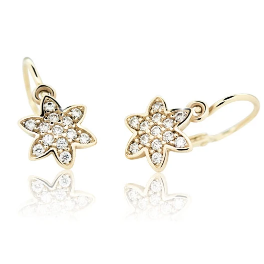 Dětské visací náušnice ze žlutého zlata ryzosti 585/000. Povrch náušnic je leštěný. Náušnice s ozdobou květu. Ozdobný kvítek je vykládaný kamínky. Průměr náušnic: 14mm, rozměr ozdoby 8,5*1,5mm. Náušnice mají bezpečnostní dětské zapínání. Krásné dětské náušnice od českého výrobce CUTIE JEWELLERY.