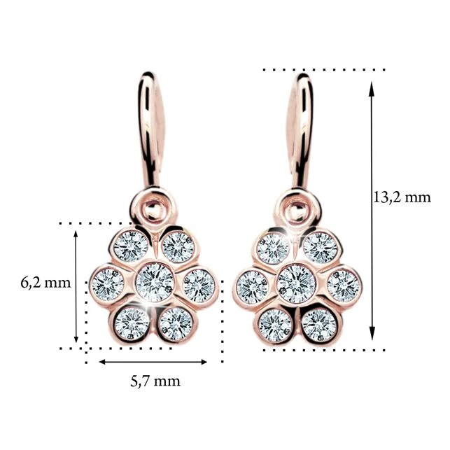 Dětské náušnice vyrobené ze 14 karátového zlata. Náušnice jsou navržené a vyrobené tak, aby jejich užívání bylo bezpečné a pohodlné pro miminka od nejútlejšího věku. Zapínání náušniček na brizuru zamezuje jejich snadnému otevření a případné ztrátě dětské náušnice. Rozměr kytičky 6,2×5,7 mm, celková „výška“ náušničky 13,2 mm. Rozměry náušniček jsou přehledně zobrazené na podpůrné fotografii.