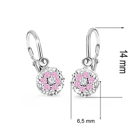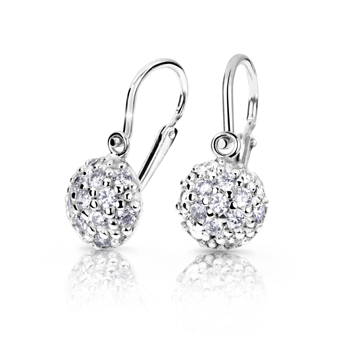 Dětské zlaté náušnice z bílého zlata 585/000. Náušničky pro děti ozdobené třpytivými zirkony. Náušnice pro miminko se zapínáním na bezpečností dětskou brizuru. Průměr ozdobné části s kamínky 6,5 mm, celková výška náušniček 14 mm.