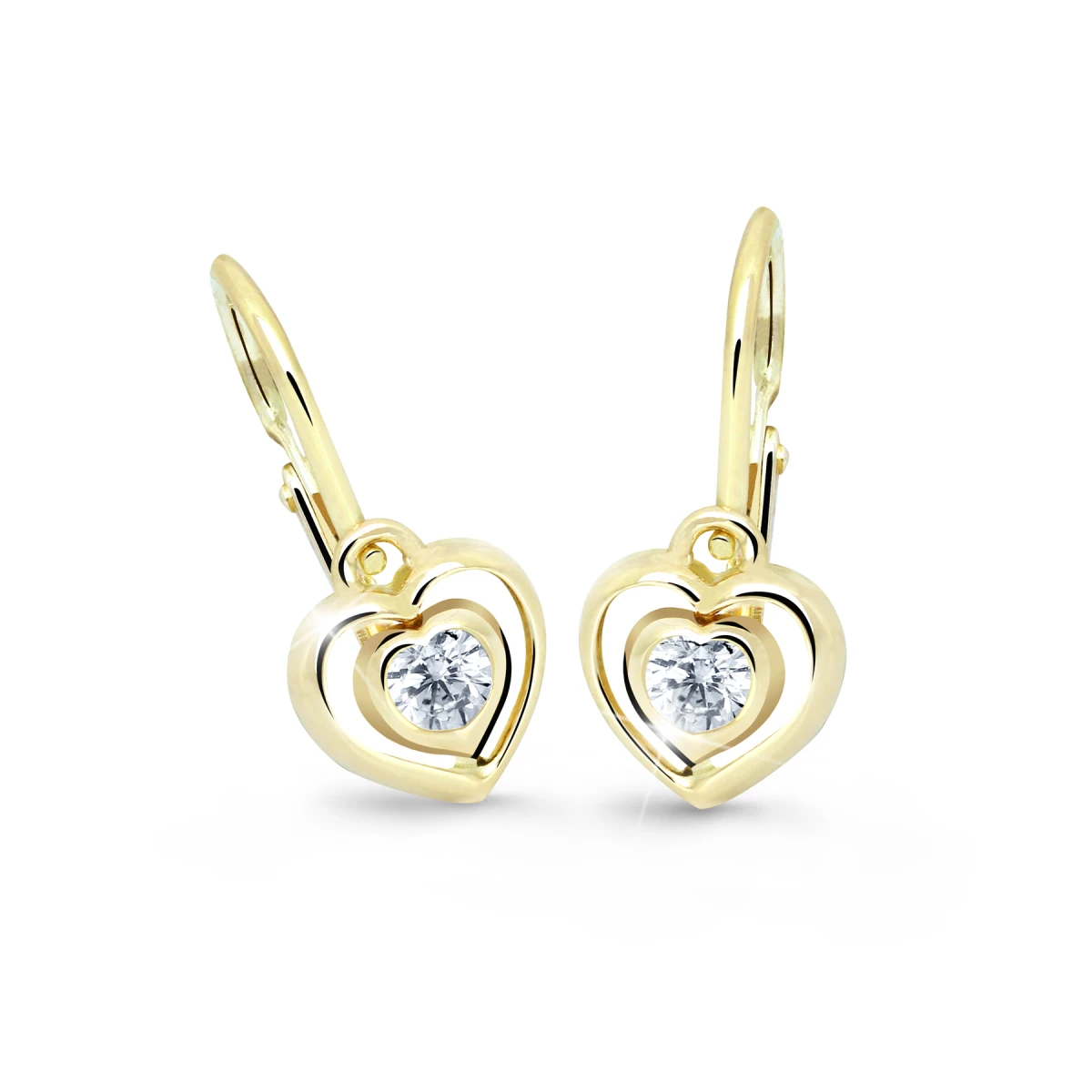 Dětské zlaté náušnice ze žlutého zlata 585/000. Náušničky pro děti ozdobené třpytivým zirkonem. Náušnice pro miminko se zapínáním na bezpečností dětskou brizuru. Rozměr ozdobného srdíčka s kamínkem 6x6 mm, celková výška náušniček 14 mm. Rozměry náušniček najdete přehledné zobrazené na podpůrné fotografii.