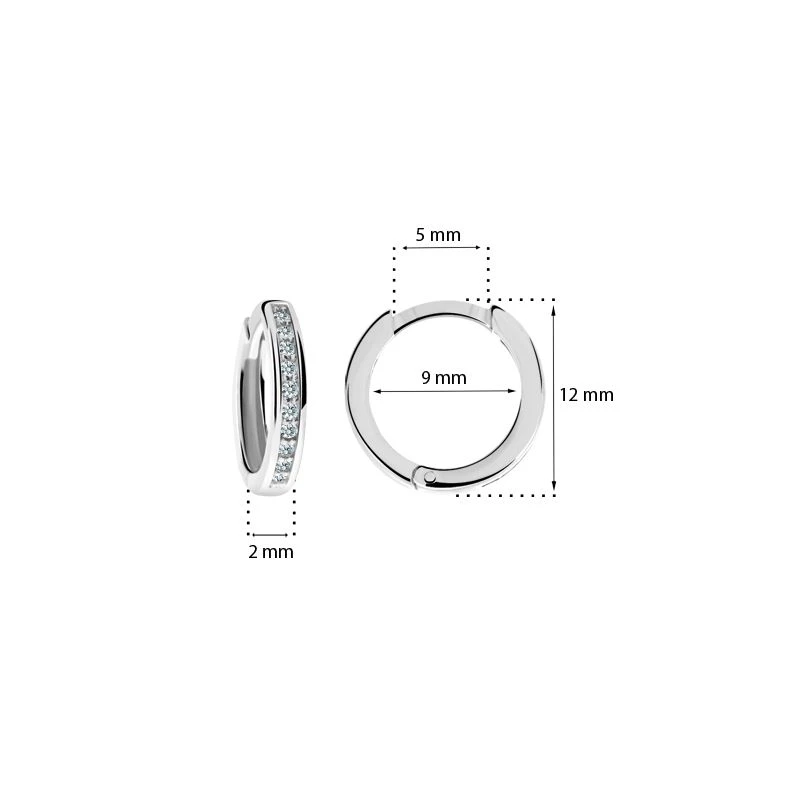 Dětské náušnice kroužky z bílého zlata 585/000. Praktický kruhový tvar dětských náušniček je zárukou jejich pohodlného užívání. Vnitřní průměr náušniček 9mm, vnější průměr 12mm. Náušničky jsou široké 2,0 mm. Dřík zapínání je dlouhý 5 mm.