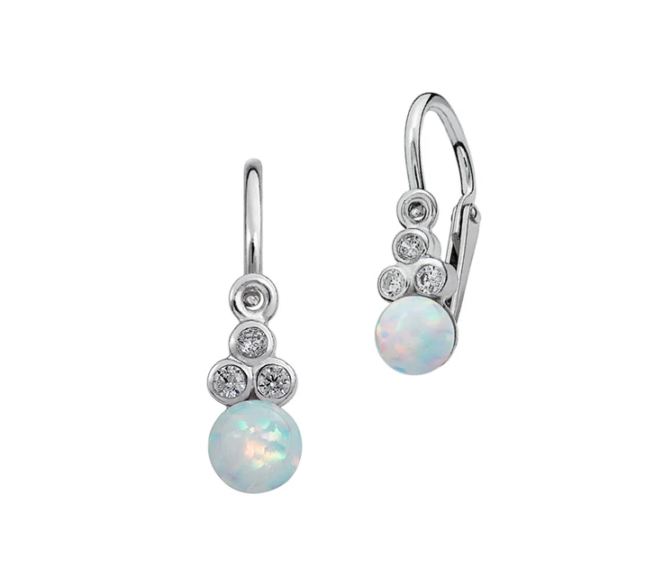 Dětské náušnice ze zlata ryzosti 585/000. Dětské náušničky zdobené zirkony a bílým kulatým opálem s průměrem 4mm. Zlaté dětské naušnice se zapínáním na dětskou brizuru. Toto zapínání zamezuje jeho snadnému otevření a následné ztrátě náušnice. Velikost náušniček 17x4mm.