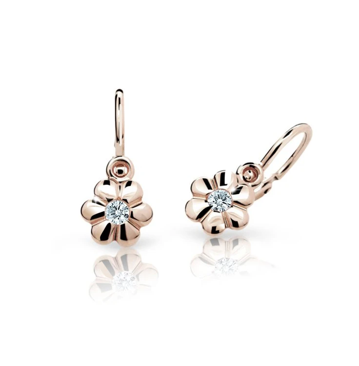 Dětské náušnice z růžového zlata 585/000. Náušnice jsou ozdobené kamínkem. Velikost náušnic 13,8mm, rozměr ozdoby s kamínkem 5,5x5,8mm. Náušnice mají bezpečnostní dětské zapínání na brizuru, které zamezuje snadnému rozevření a ztrátě náušničky.