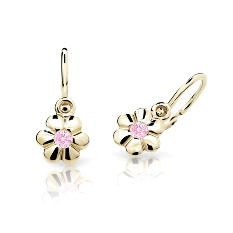 Zlaté dětské náušnice vyrobené ze žlutého zlata 585/000. Náušnice jsou ozdobené kamínkem. Velikost náušnic 13,8mm, rozměr ozdoby s kamínkem 5,5x5,8mm. Náušnice mají bezpečnostní dětské zapínání na brizuru, které zamezuje snadnému rozevření a ztrátě náušničky.