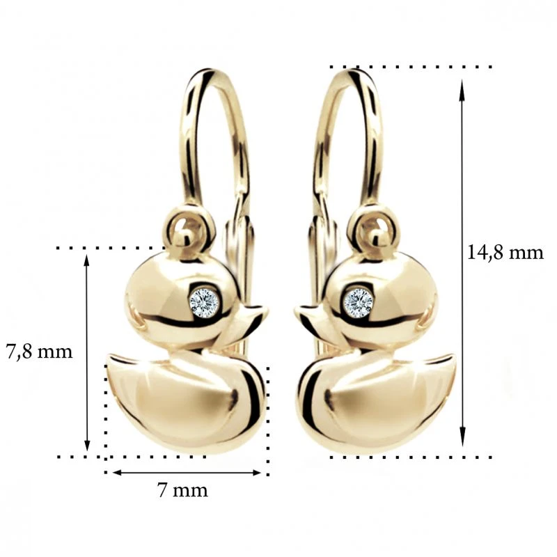 Dětské náušnice vyrobené ze žlutého zlata ryzosti 585/1000. Náušnice jsou navržené a zhotovené s ohledem na komfortní a bezpečné užívání pro miminka od nejútlejšího věku. Zapínání náušniček na dětskou brizuru zamezuje jejich snadnému otevření a následné ztrátě dětské náušničky. Káčátko má rozměr 7×7,8 mm, celková „výška“ náušničky 14,8 mm. Náušničky pro děti Cutie jsou dodávané v dárkové krabičce ve tvaru pyramidy.